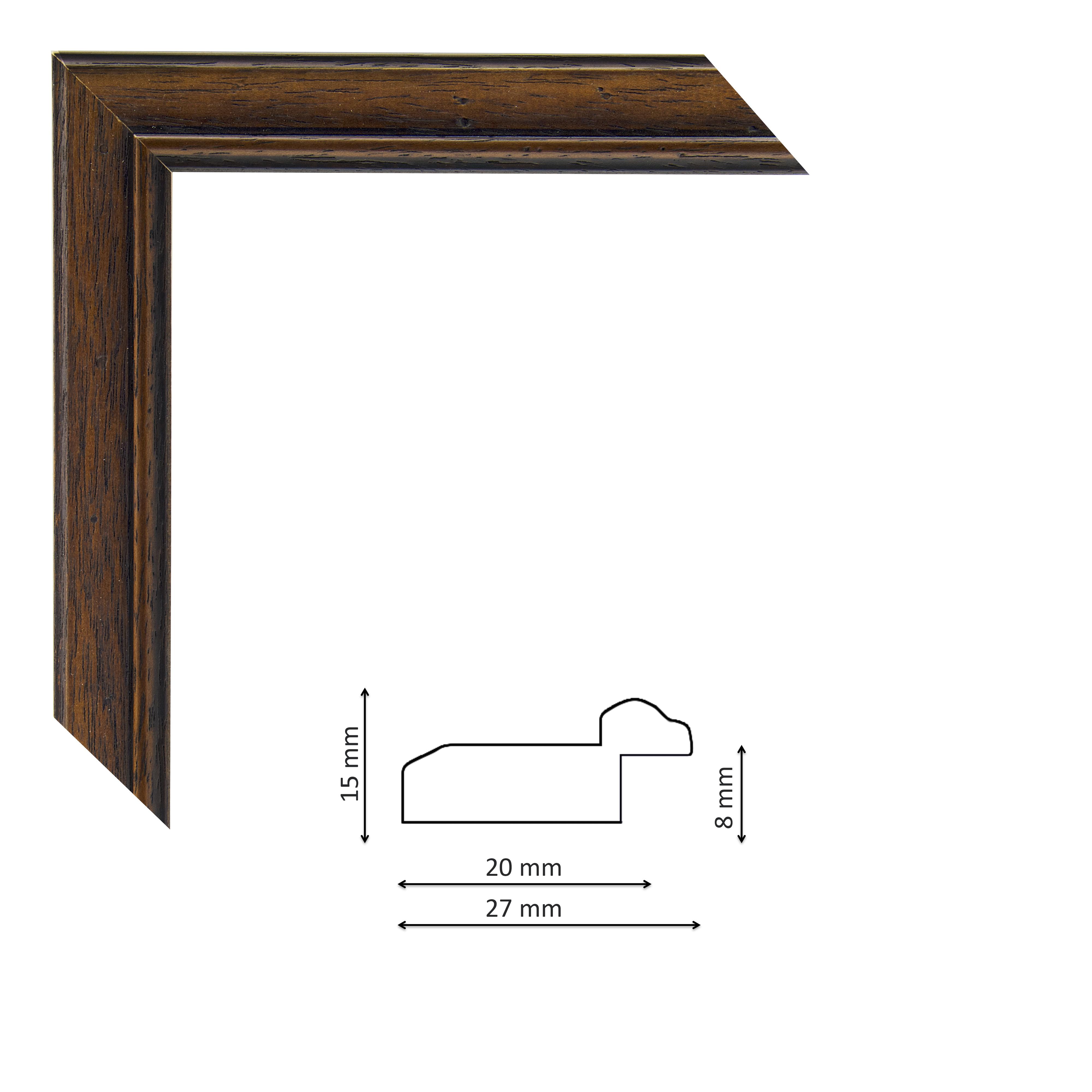 Keskeny, enyhén profilos képkeretléc dió színben, trópusi fából.