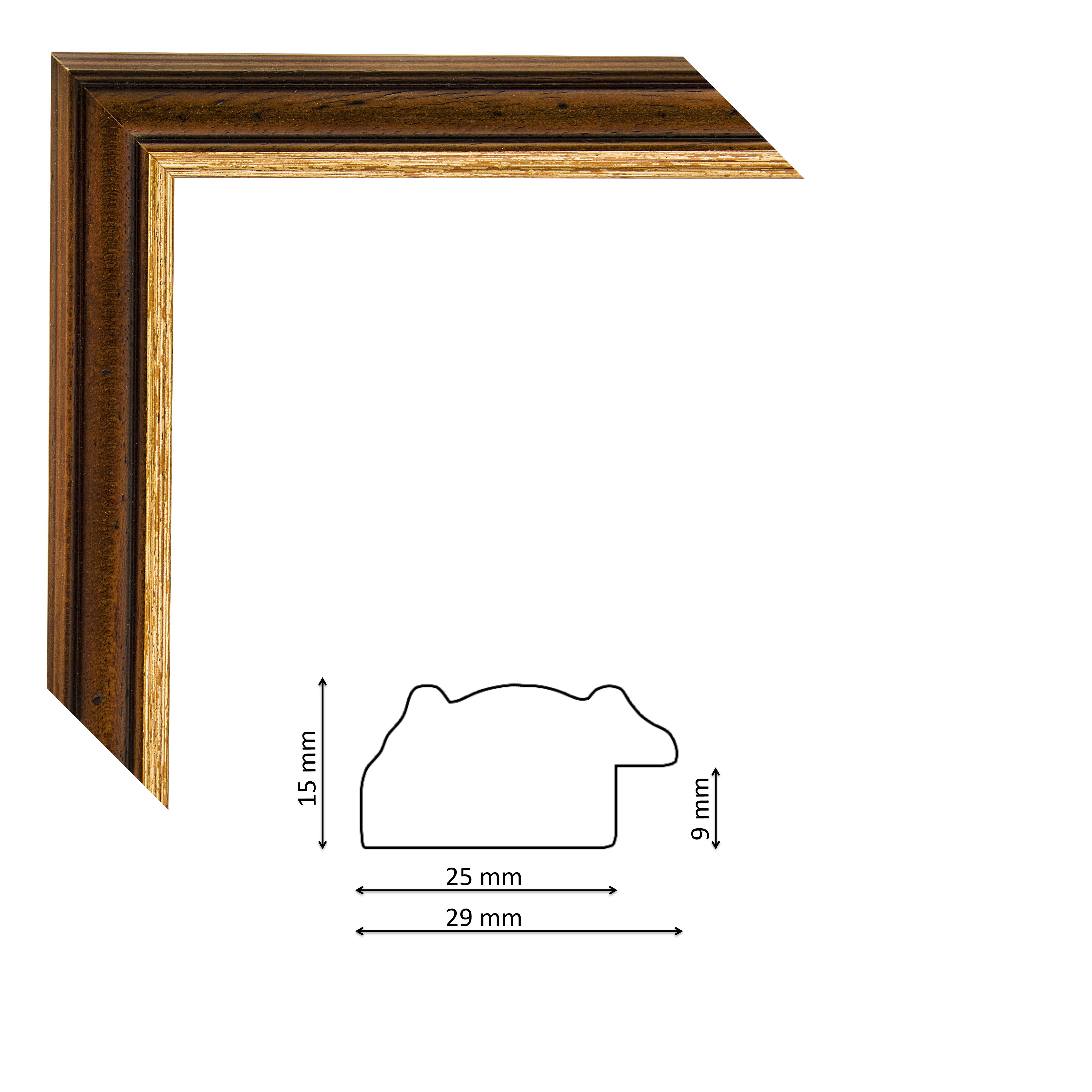 Képkeretléc 041 am04 Kérdése van? Modern, enyhén profilos olasz képkeretléc dió színben, arany csíkkal, szuette hatással, trópusi fából.