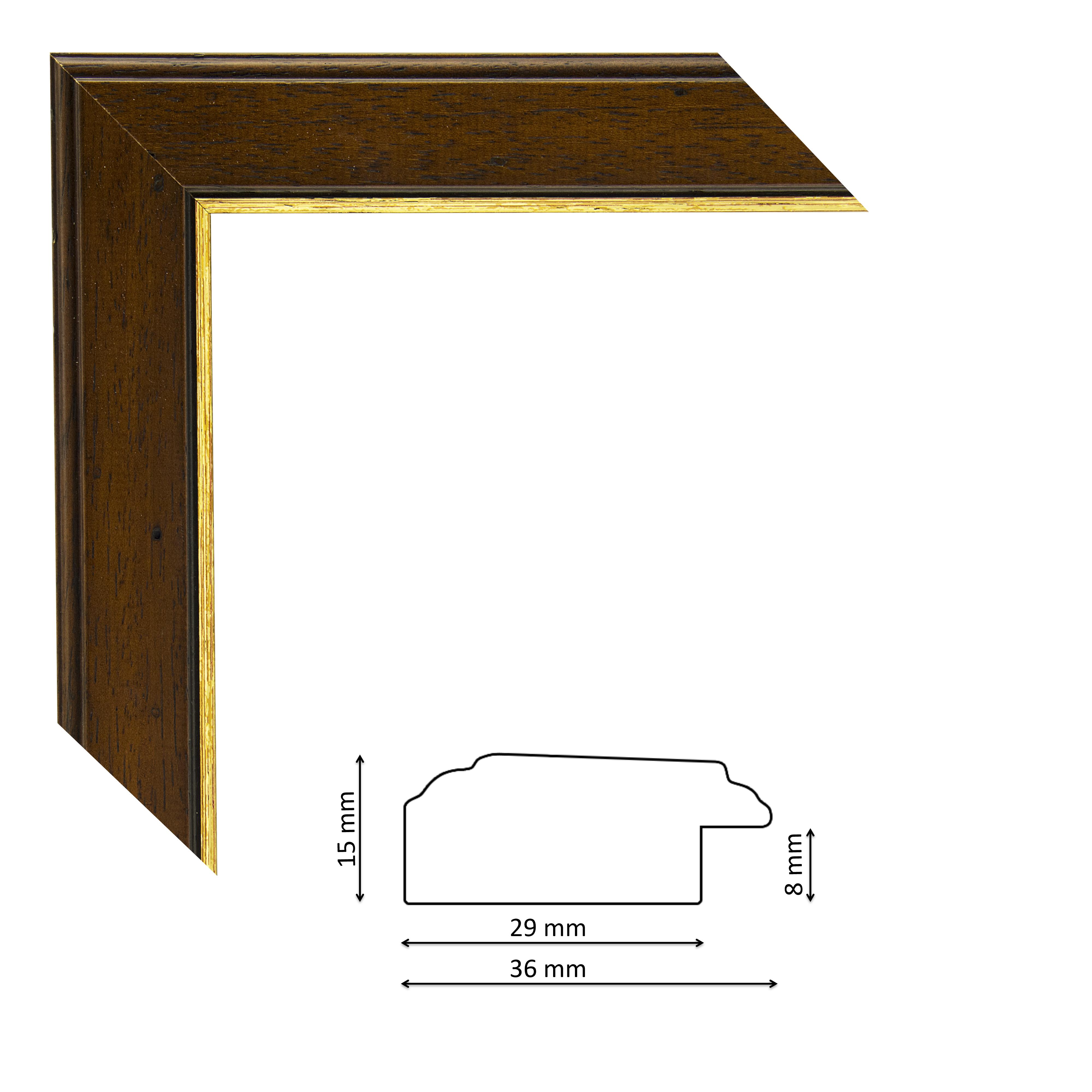 Képkeretléc 043 am04 Kérdése van? Modern, enyhén profilos olasz képkeretléc dió színben, arany csíkkal, trópusi fából.
