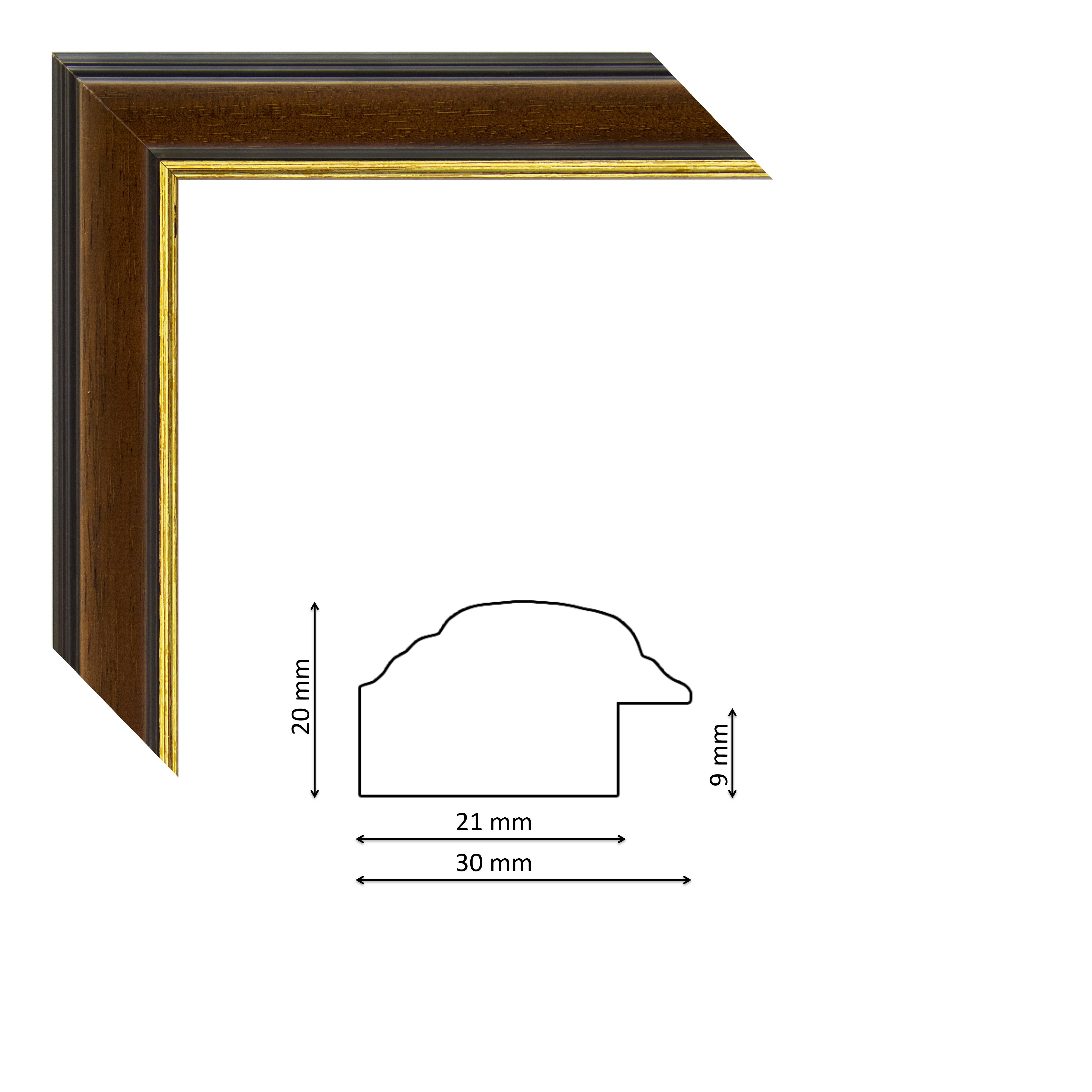 Képkeretléc 901 a004 Kérdése van? Barna, enyhén profilos olasz képkeretléc belül arany csíkkal, trópusi fából.