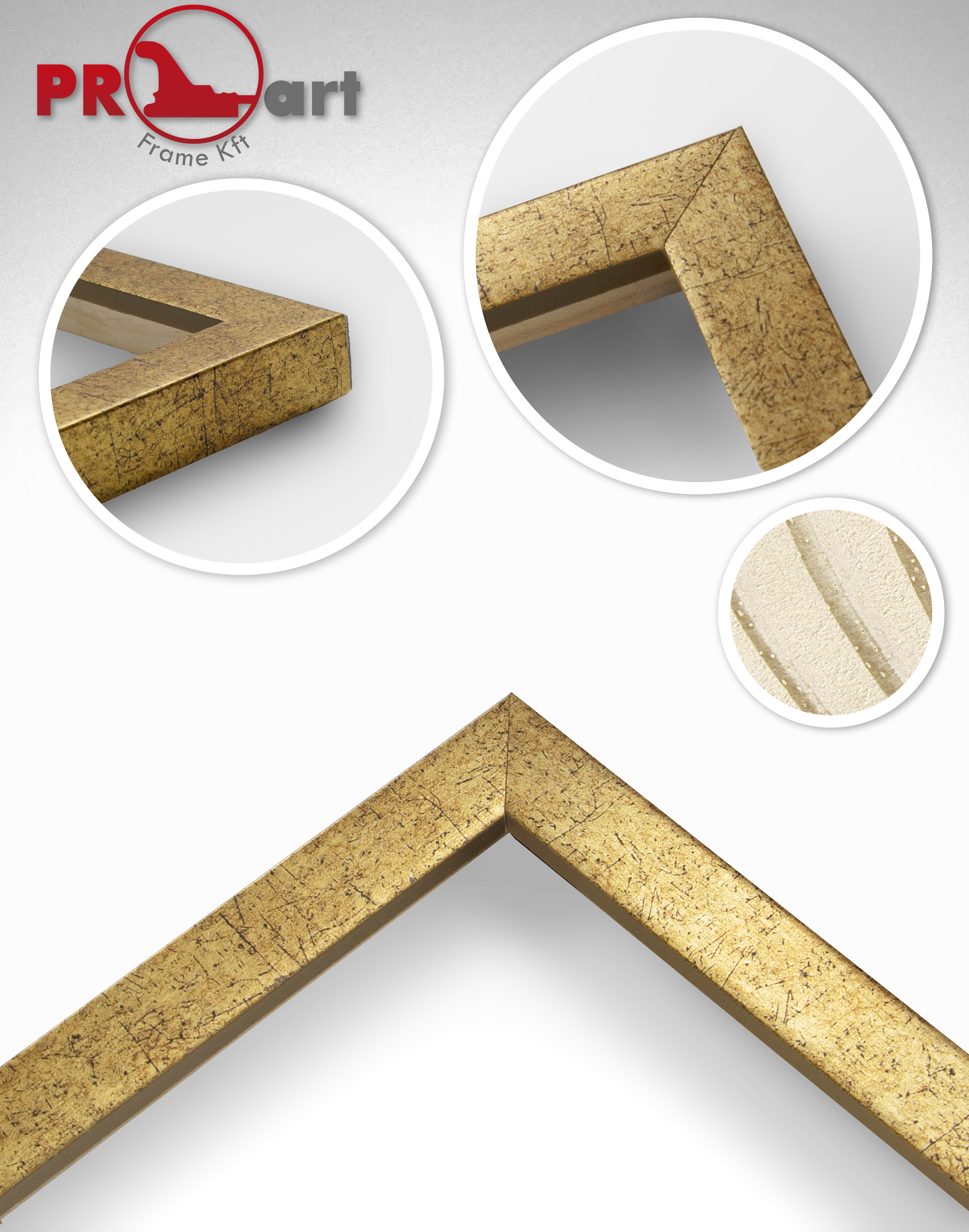 Keskeny, modern képkeretléc arany színben, feketés kopásokkal.