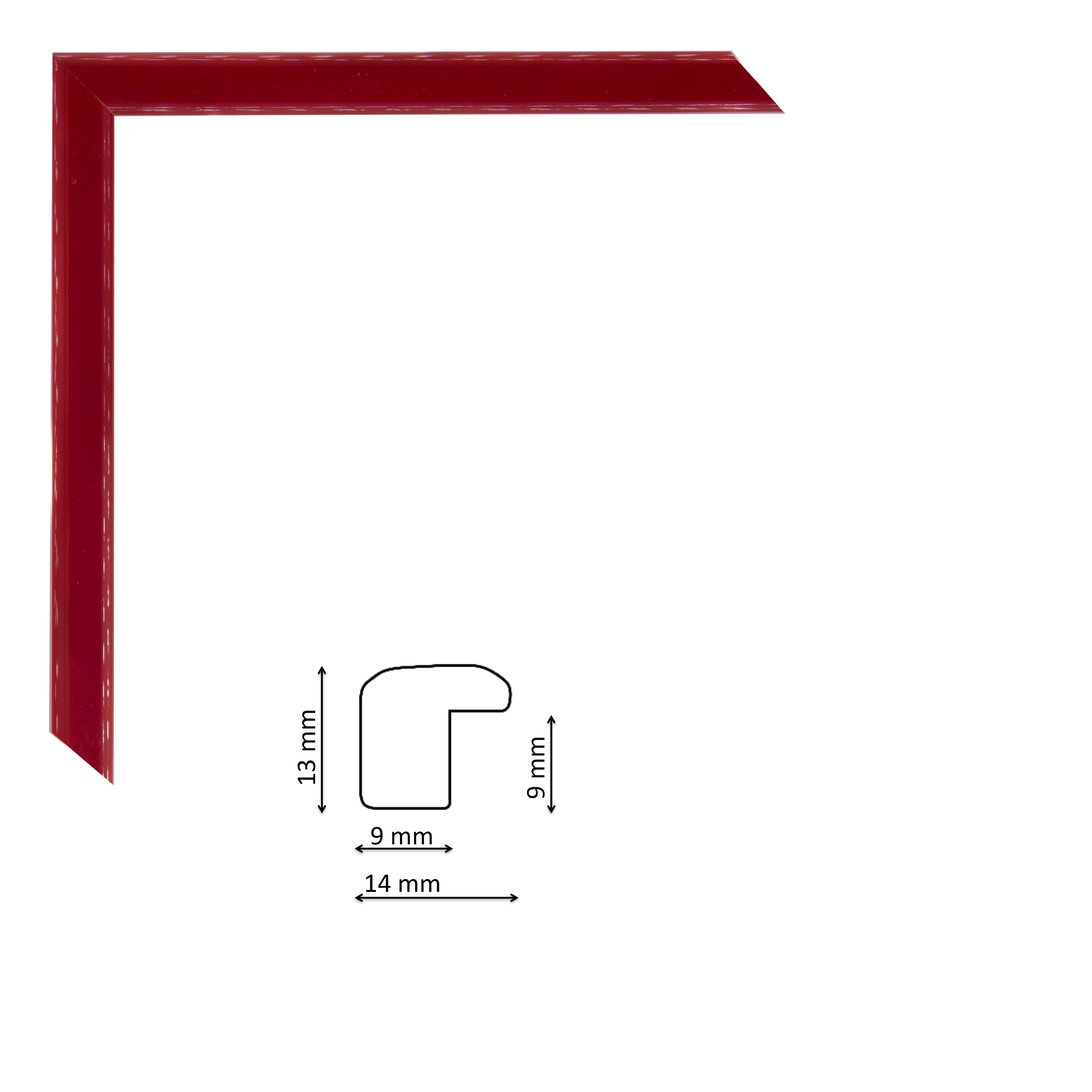 Lakkozott piros fa képkeretléc, keskeny, enyhén domború profillal.