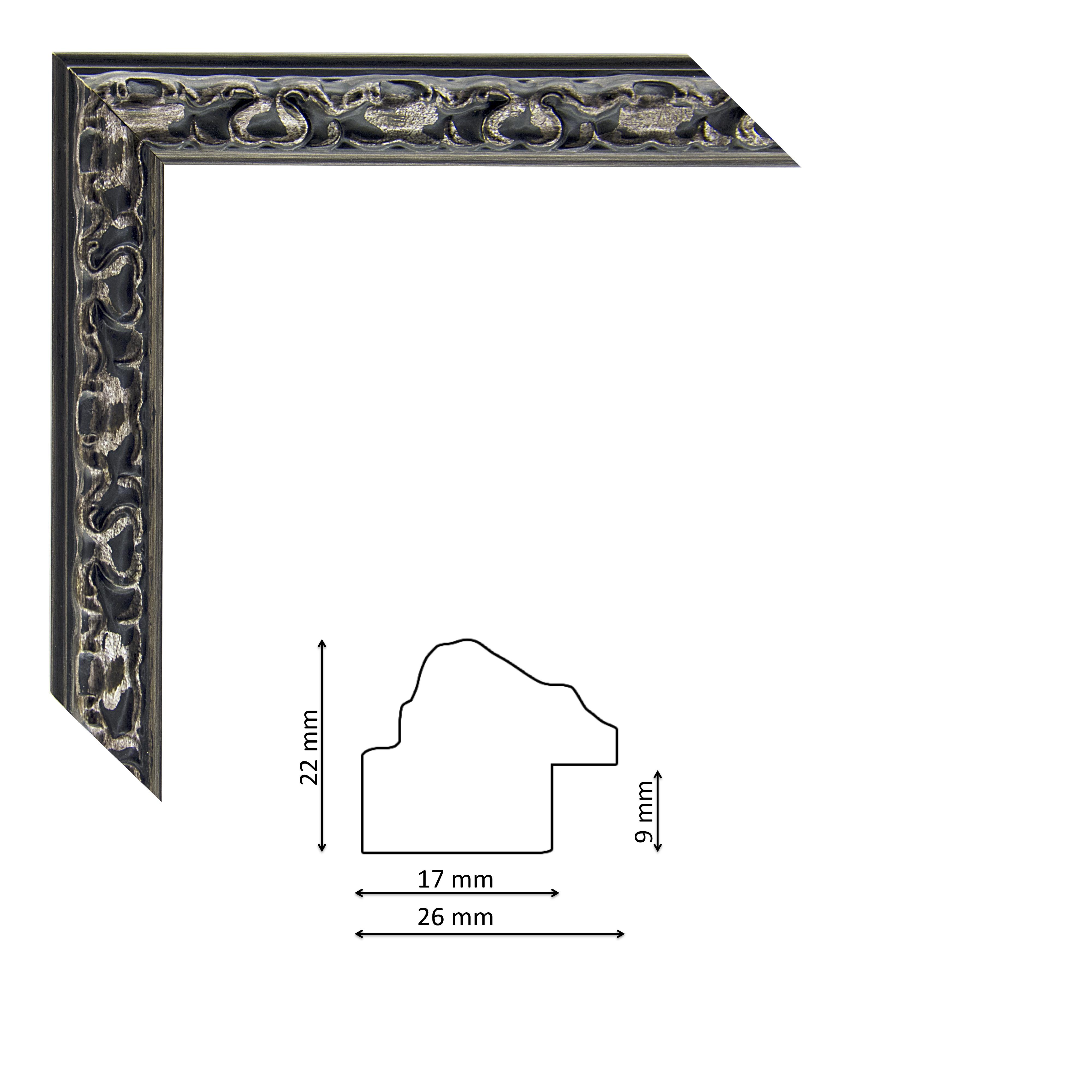 Képkeretléc IM3082-674 Kérdése van? Faragott mintás spanyol képkeretléc grafit színben, ezüstös visszatöréssel, trópusi fából.