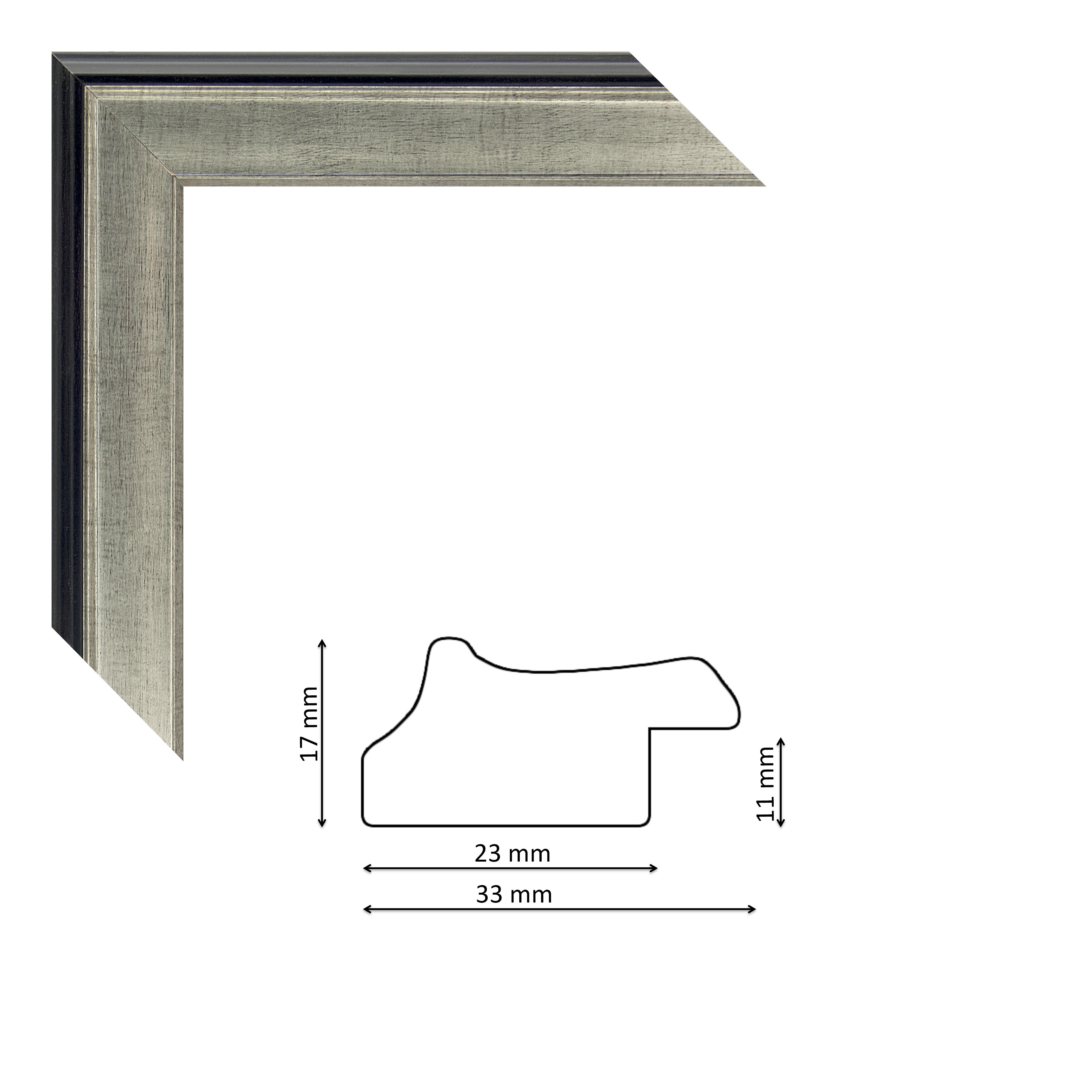 Képkeretléc IM5301-638 Kérdése van? Modern, enyhén profilos ezüst- feketén húzott spanyol képkeretléc trópusi fából.