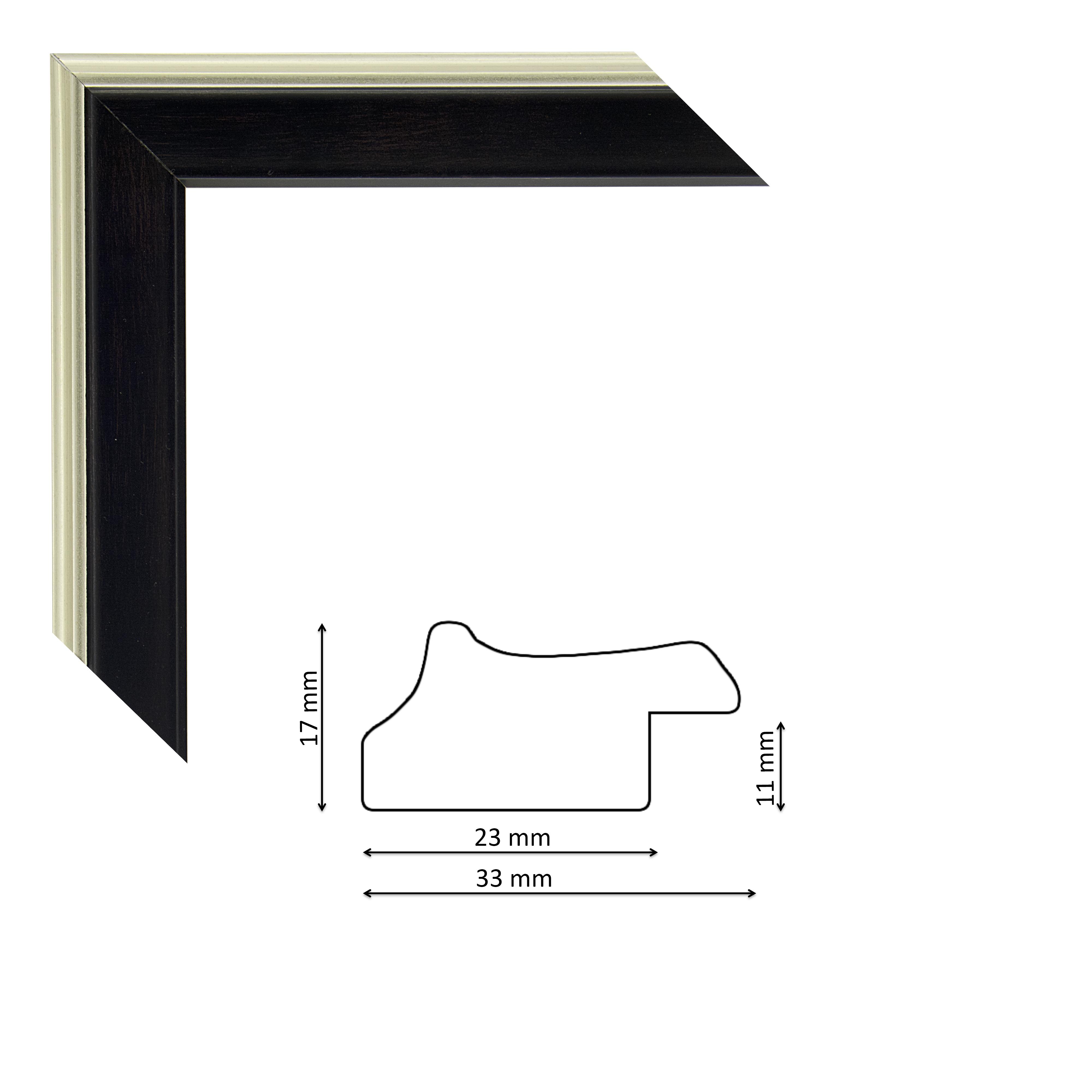 Képkeretléc IM5301-806 Kérdése van? Modern, enyhén profilos sötétbarna spanyol képkeretléc, ezüst széllel, trópusi fából.