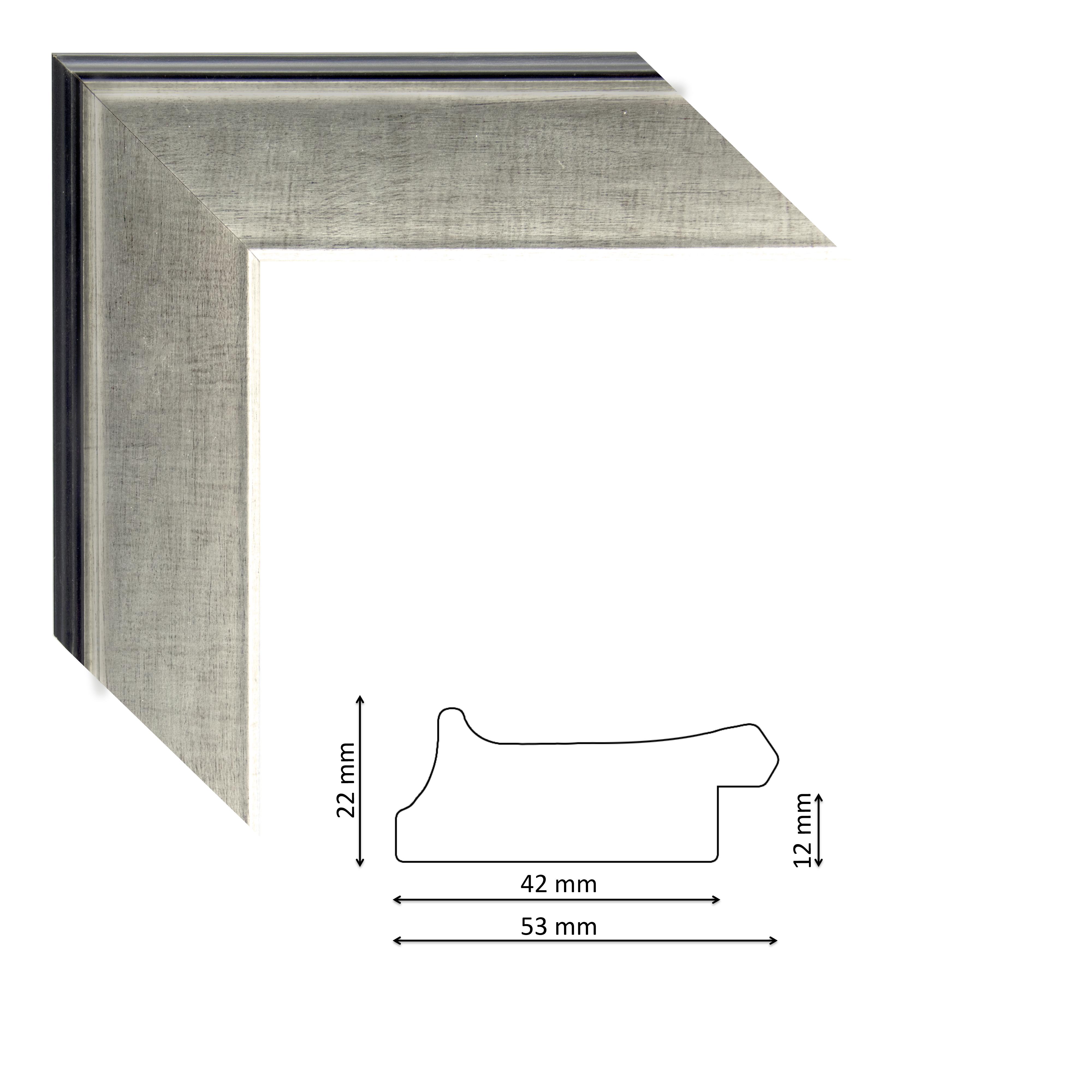 Képkeretléc IM5302-638 Kérdése van? Modern, enyhén profilos ezüst- feketén húzott spanyol képkeretléc trópusi fából.