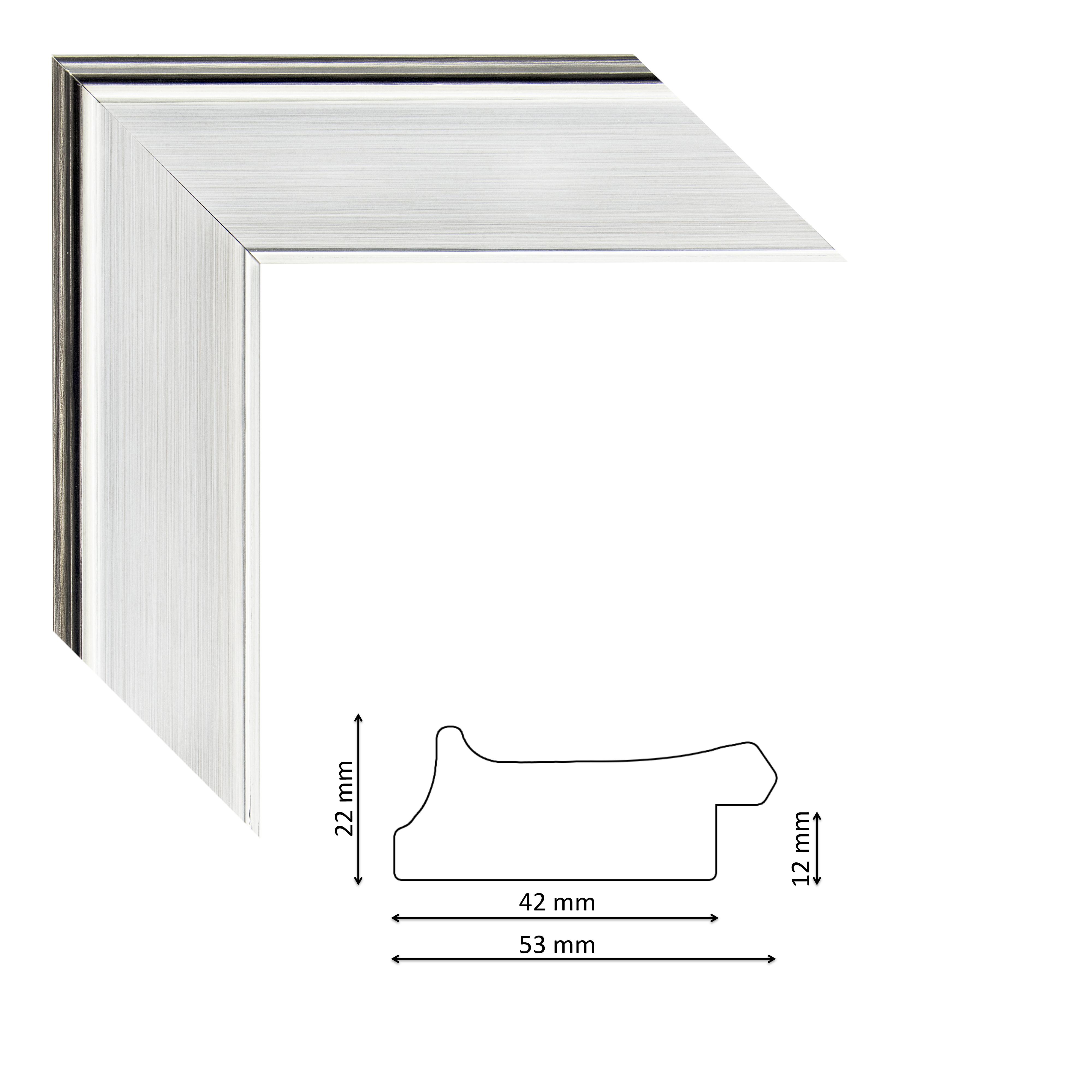 Képkeretléc IM5302-665 Kérdése van? Modern, enyhén profilos ezüst színű spanyol képkeretléc, fekete széllel, trópusi fából.