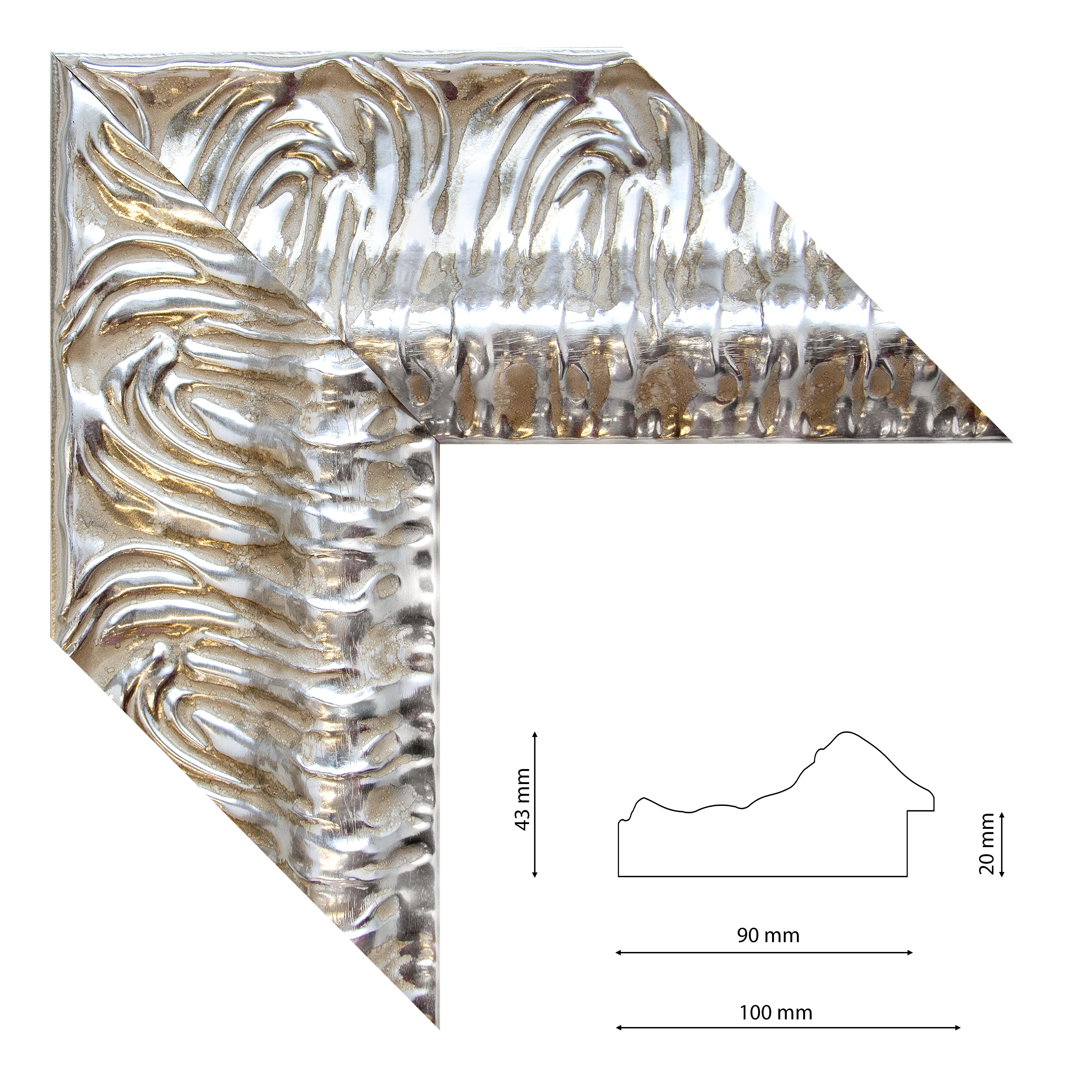 Képkeretléc IM5899-650 Kérdése van? Faragott mintás, negatív profilú spanyol képkeretléc fényes ezüst fóliával, trópusi fából.