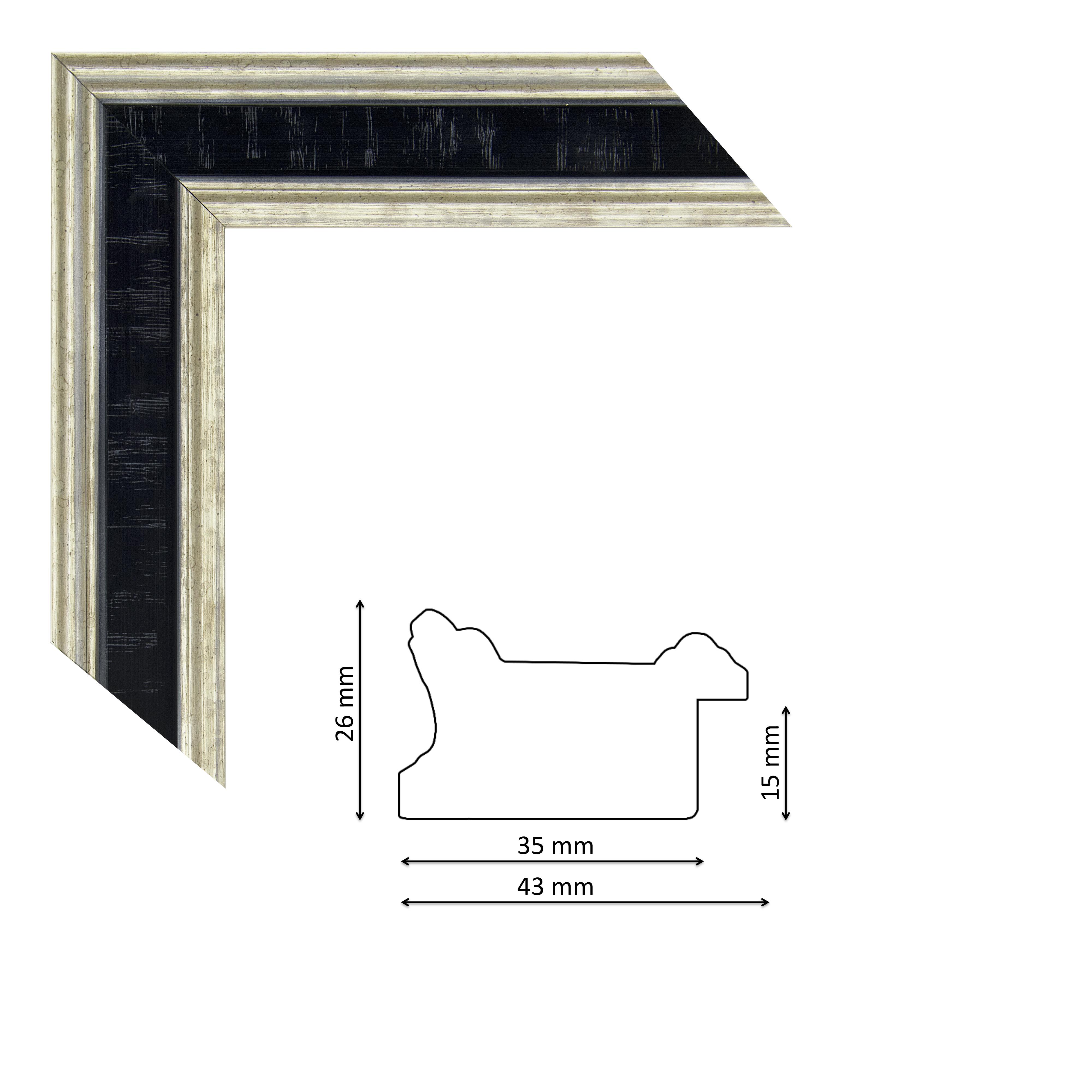Képkeretléc IM6201-670 Kérdése van? Enyhén profilos spanyol képkeretléc fekete színben, ezüst szélekkel, trópusi fából.