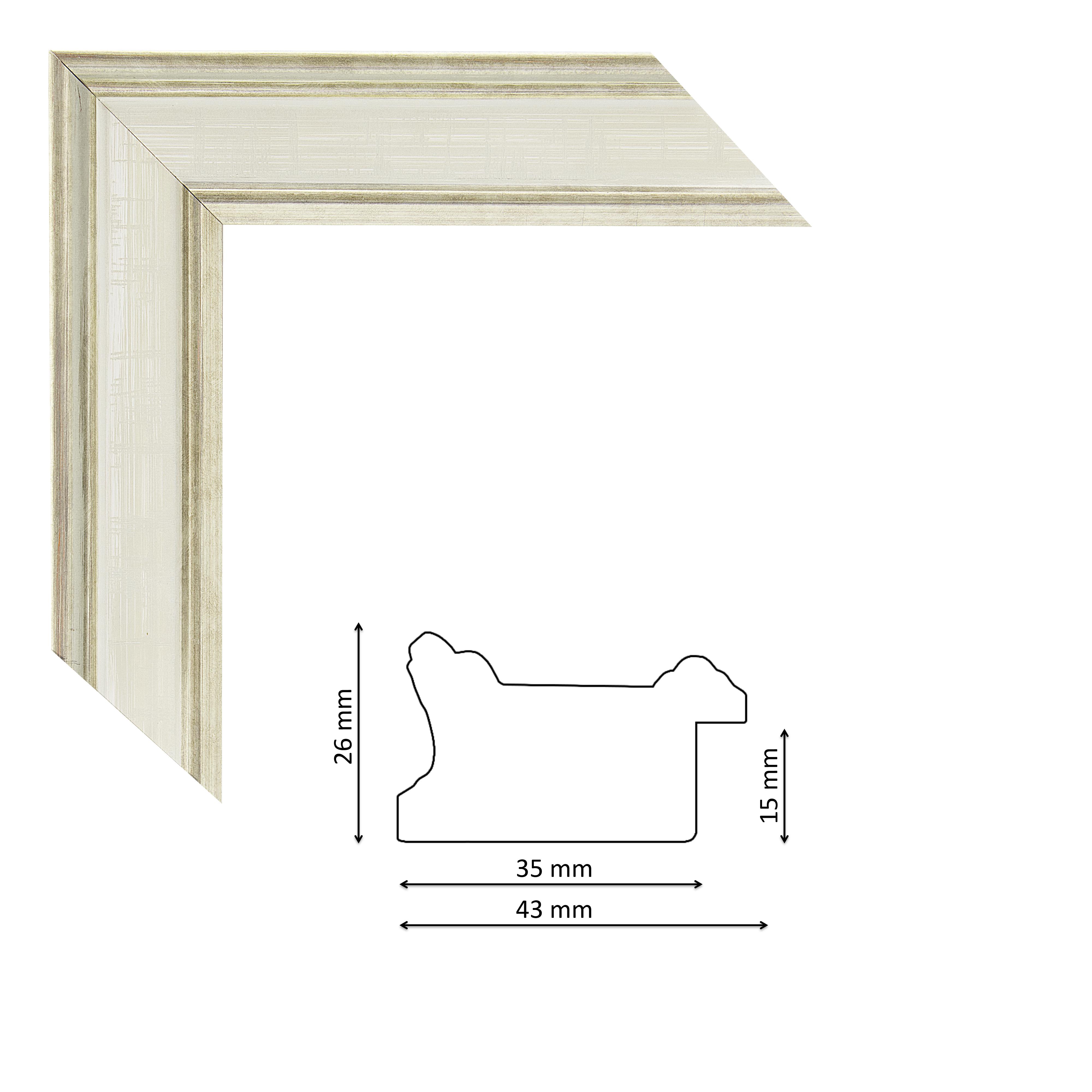 Képkeretléc IM6201-686 Kérdése van? Enyhén profilos spanyol képkeretléc elefántcsont színben, ezüst szélekkel, trópusi fából.