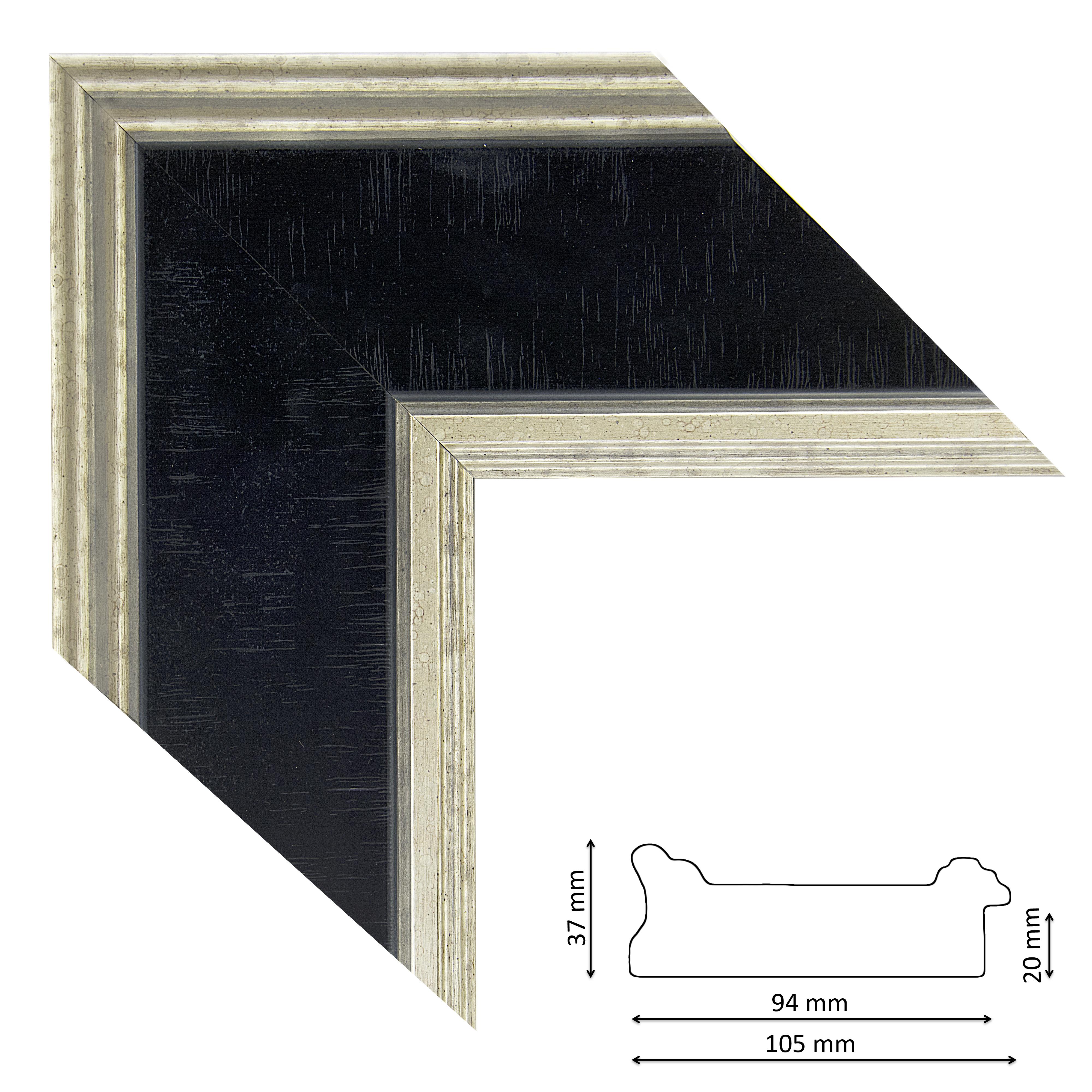 Képkeretléc IM6203-670 Kérdése van? Enyhén profilos spanyol képkeretléc fekete színben, ezüst szélekkel, trópusi fából.
