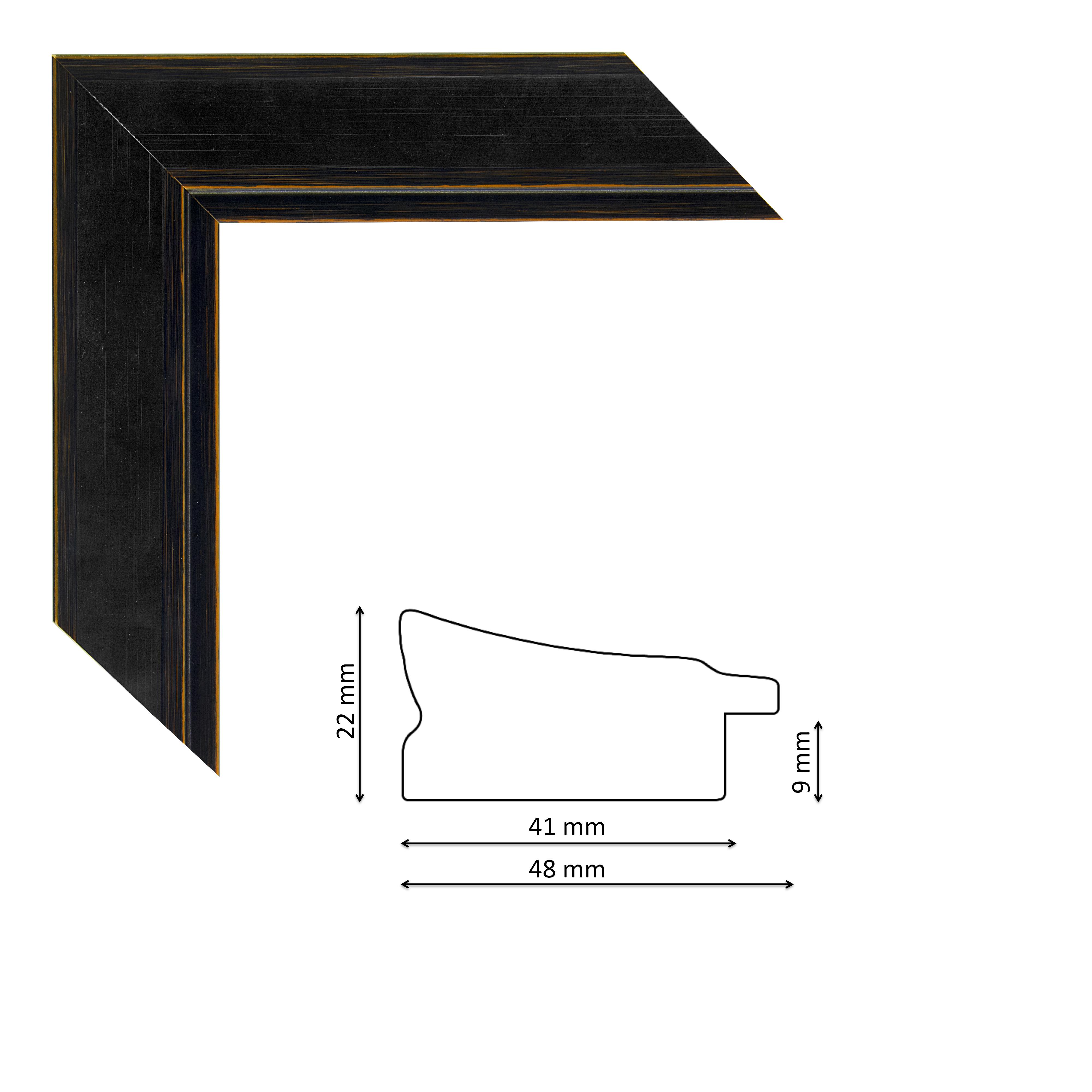 Képkeretléc IM7501-471 Kérdése van? Modern, enyhén befelé mélyülő profilú, spanyol képkeretléc fekete színben, narancsos húzásokkal, trópusi fából.