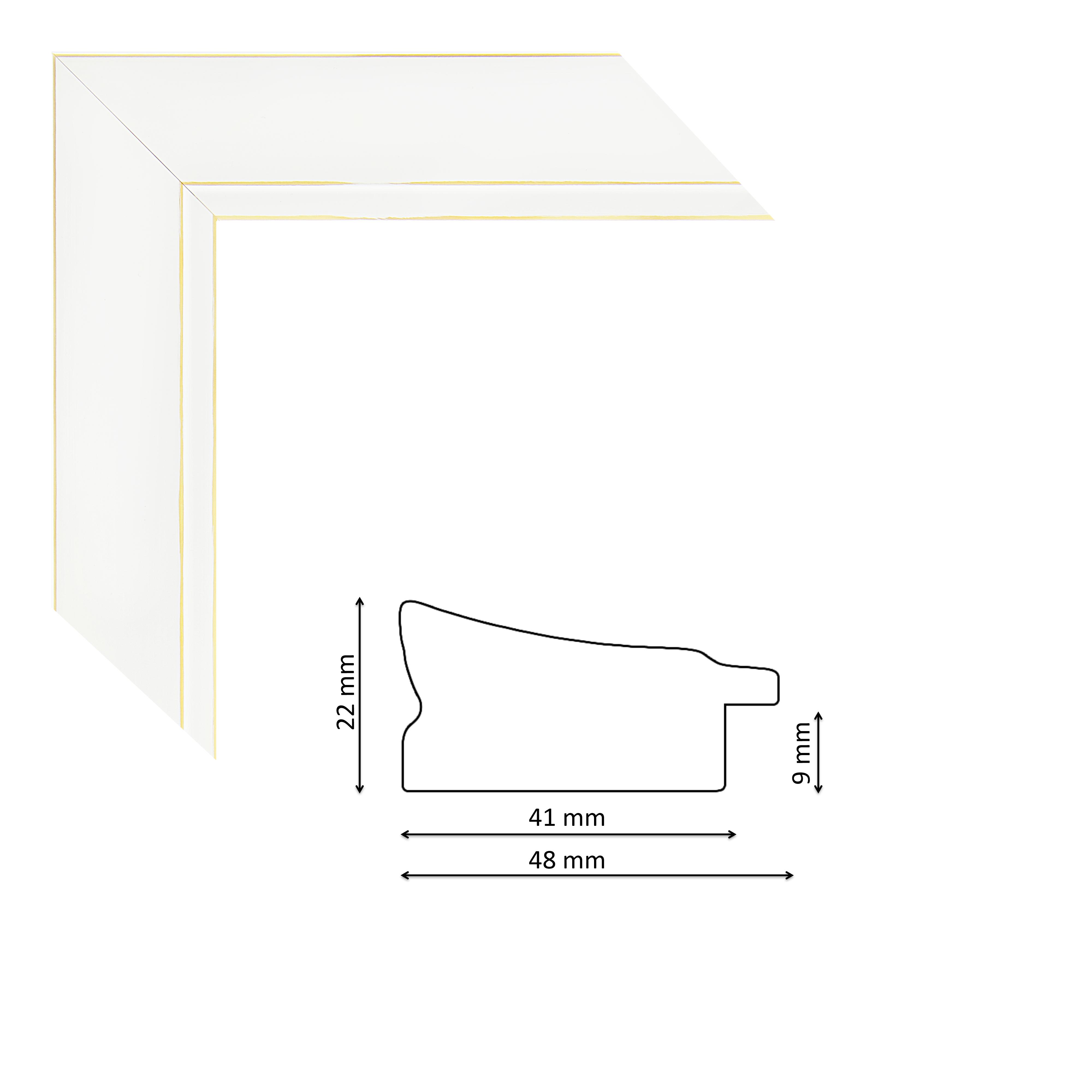 Képkeretléc IM7501-481 Kérdése van? Modern, enyhén befelé mélyülő profilú, spanyol képkeretléc fehér színben, natur visszatörésekkel, trópusi fából.