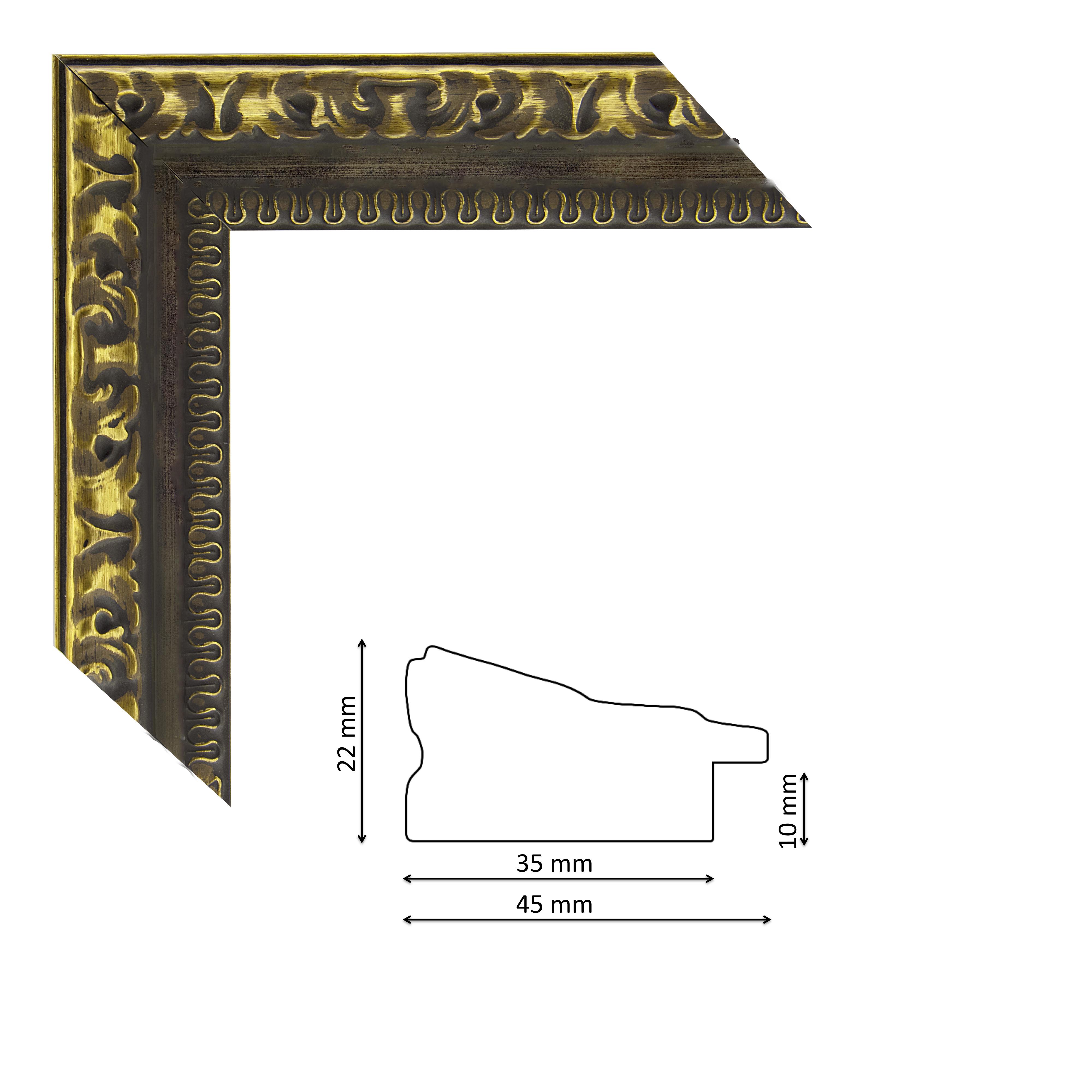 Képkeretléc IM7531-477 Kérdése van? Faragott mintás spanyol képkeretléc belül vékony mintasorral, barna színben, arany antikolással, trópusi fából.