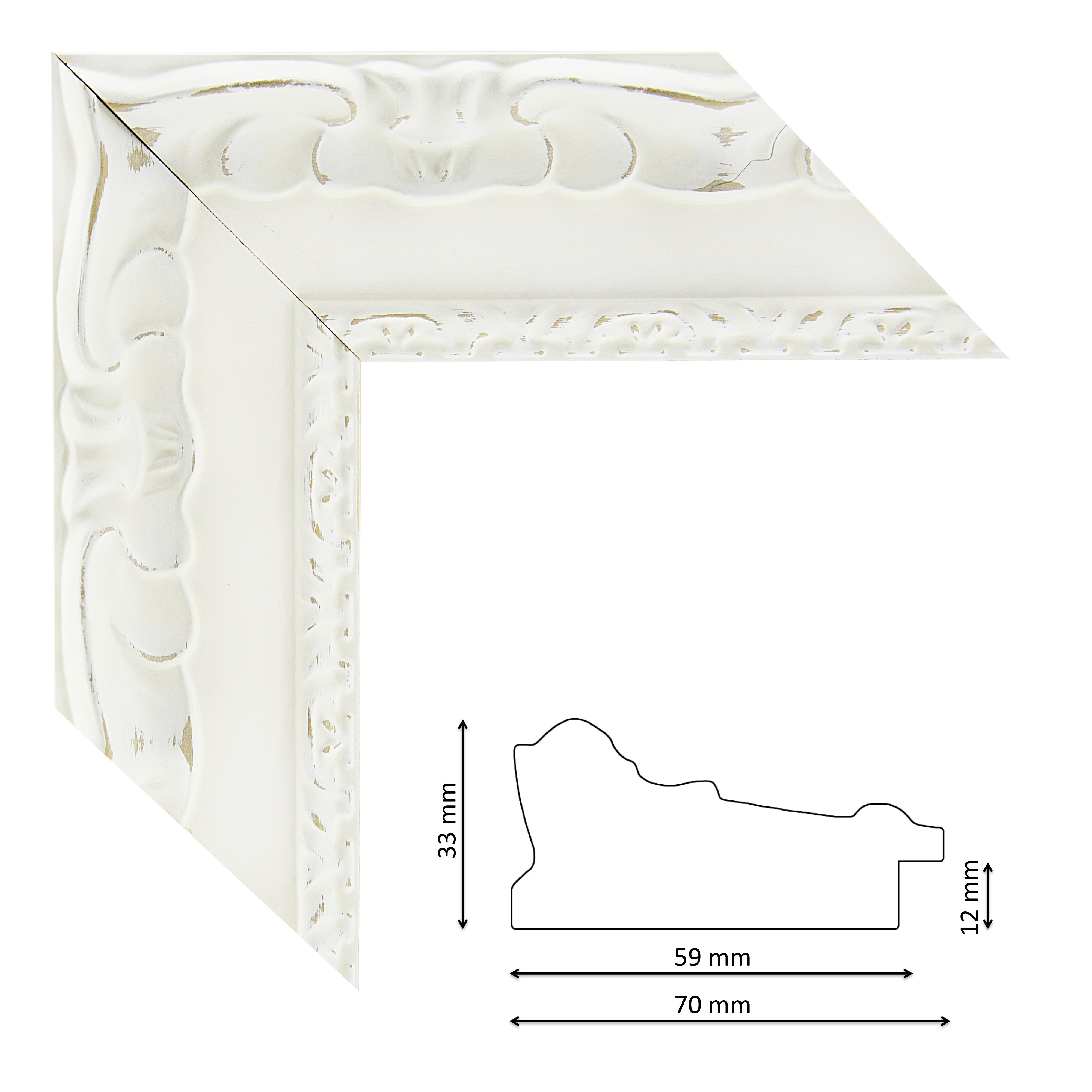 Képkeretléc IM7532-581 Kérdése van? Faragott mintás spanyol képkeretléc belül vékony mintasorral, fehér színben, natur visszatörésekkel, trópusi fából.