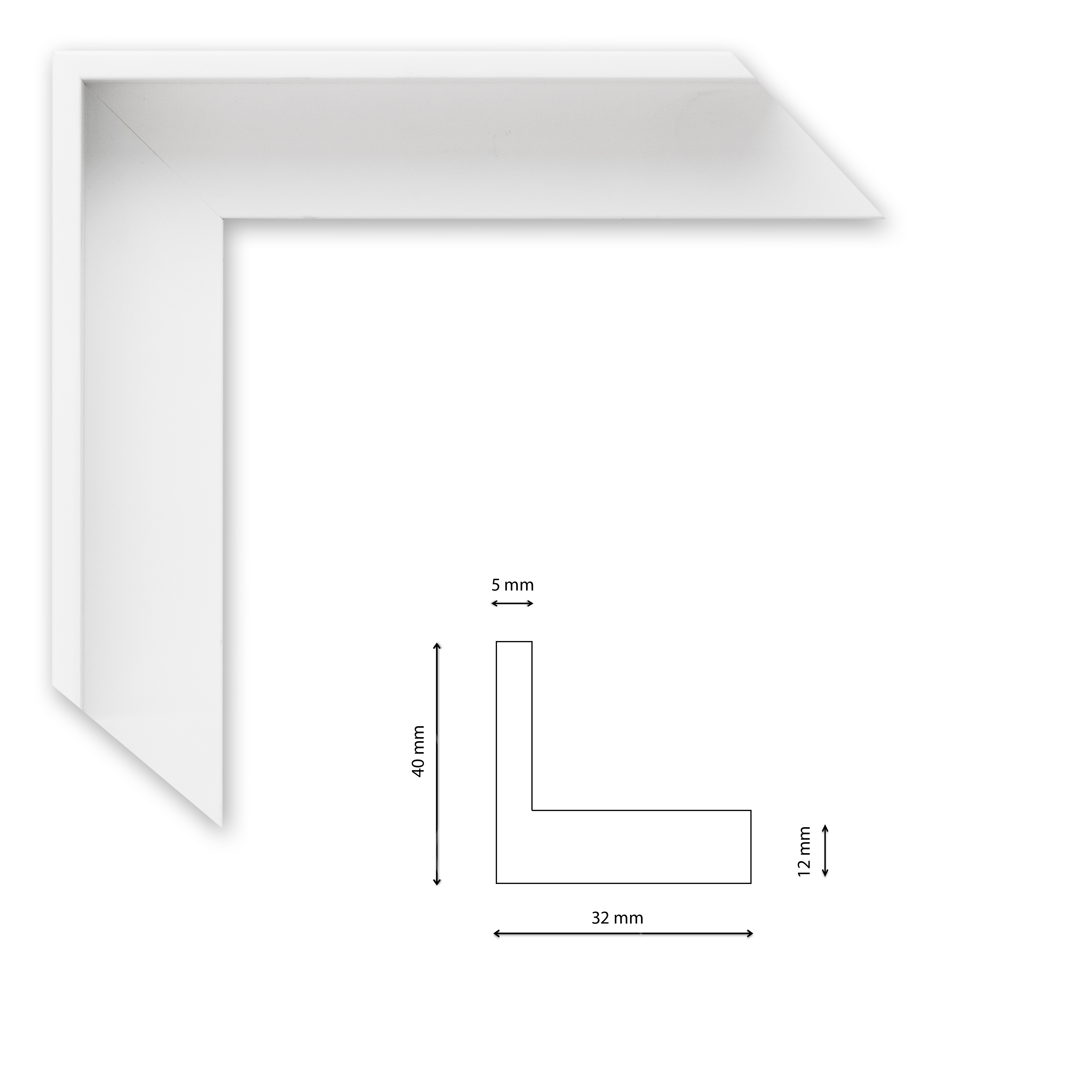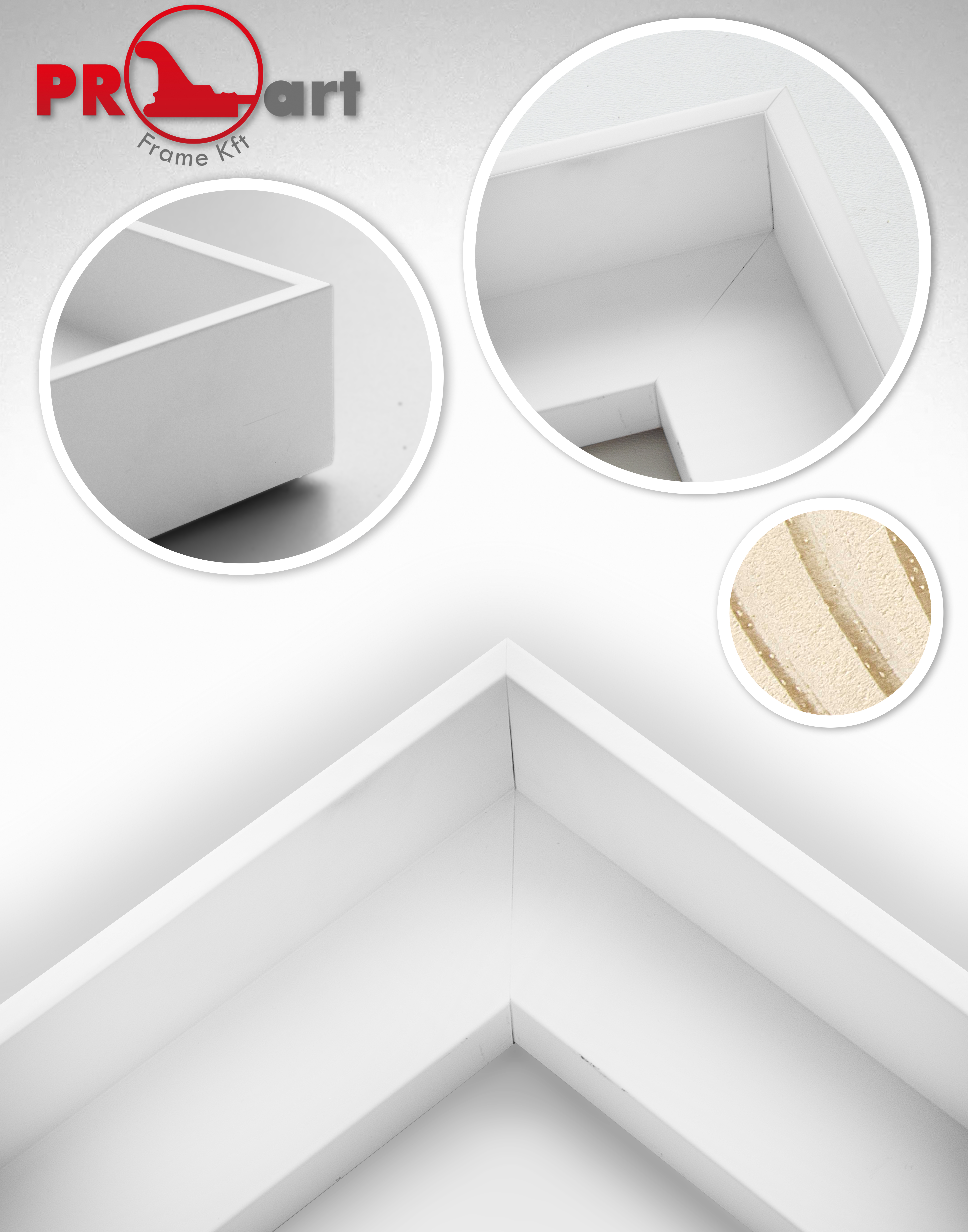 Matt fehér színű "L" - alakú kiállítókeret, vékony éllel.