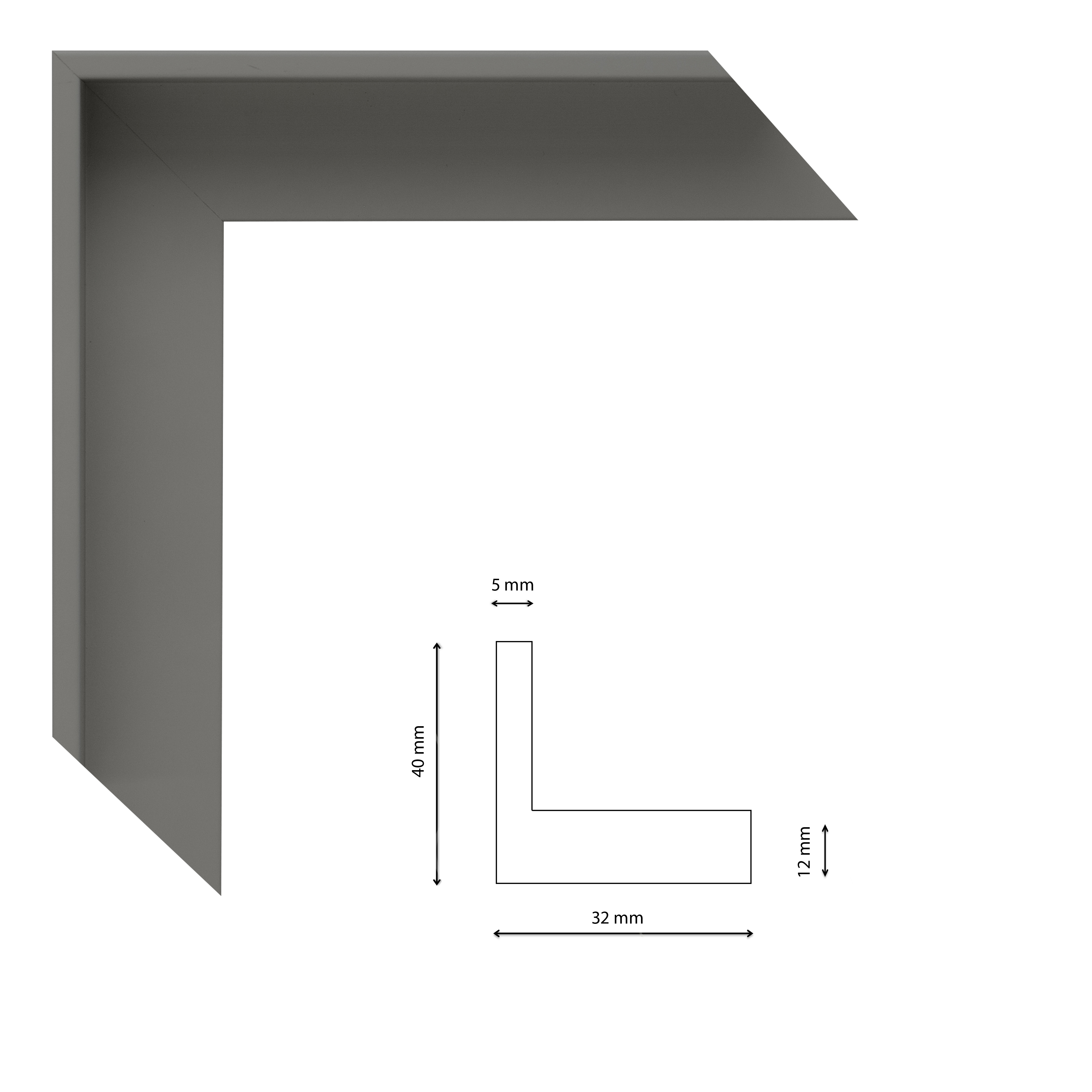 Szürke színű "L"-alakú kiállító keret, vékony éllel.