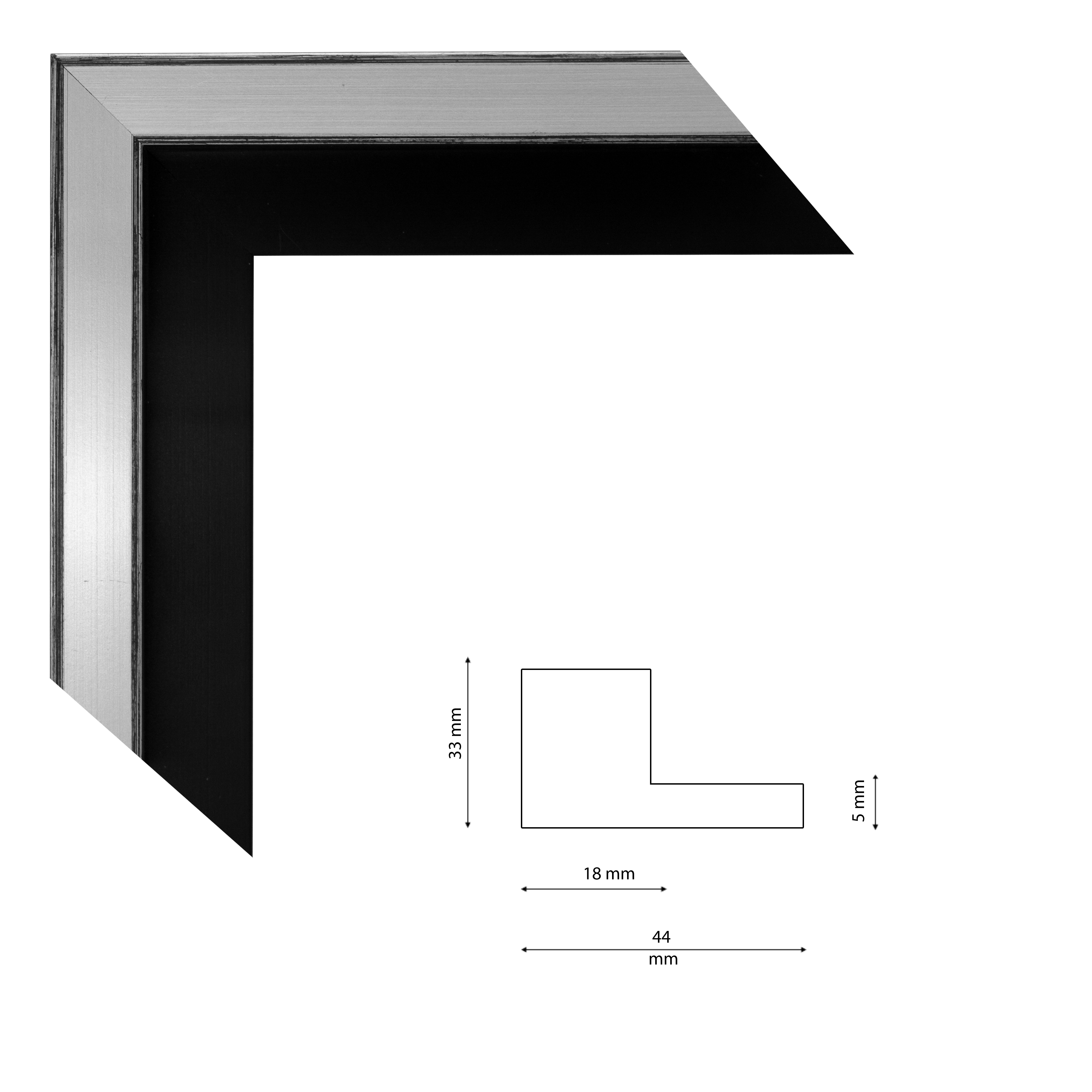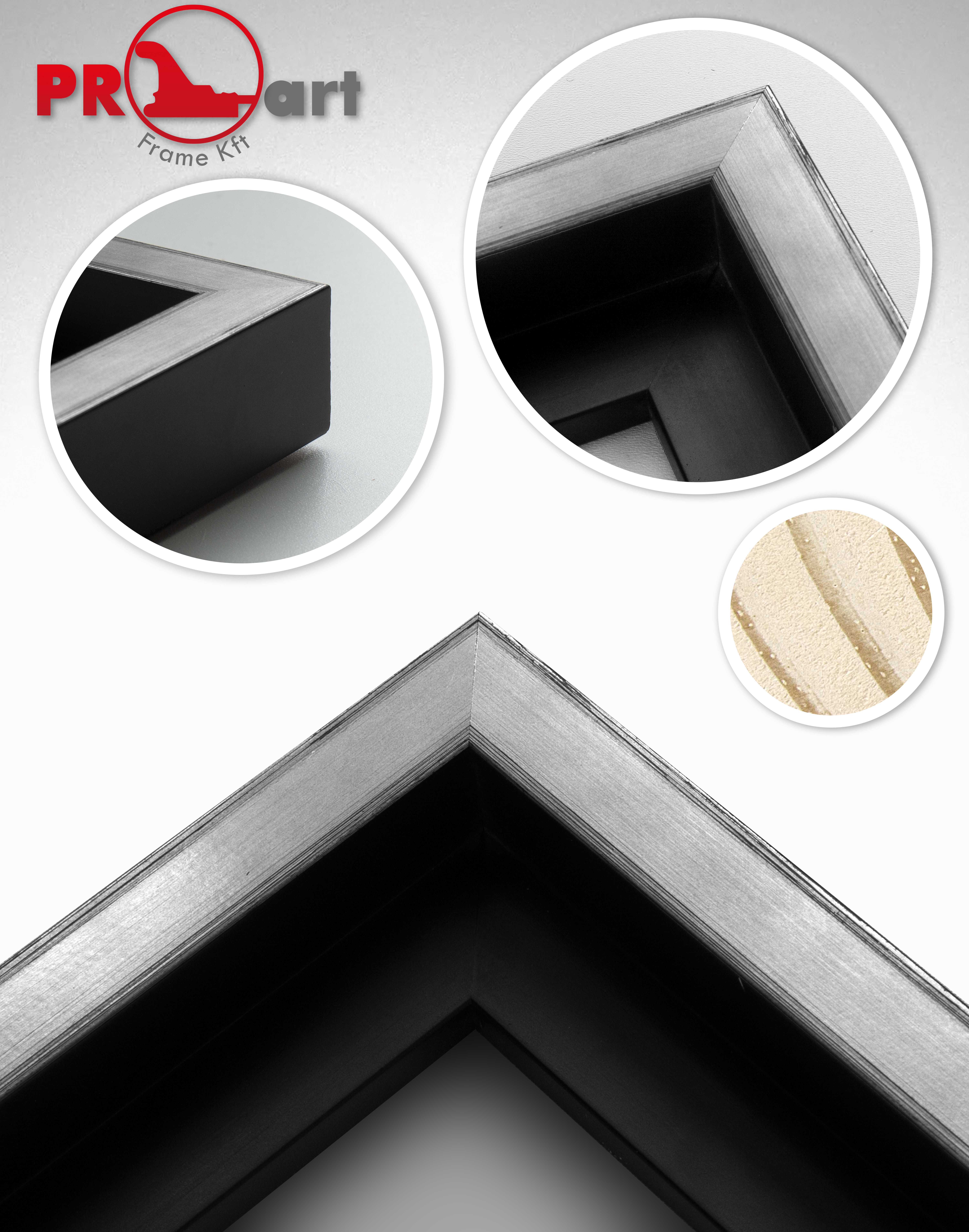 Fekete színű "L" alakú kiállító keret, ezüst éllel.