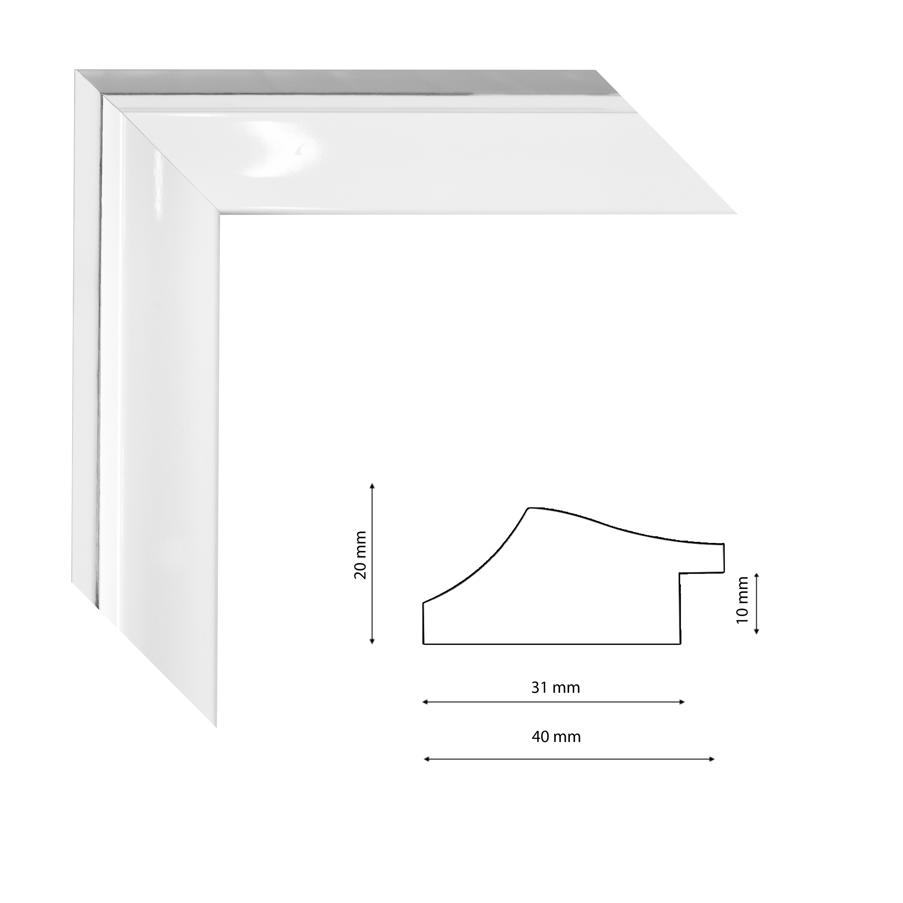 Lakk fehér képkeretléc, szélén metál ezüst színnel.