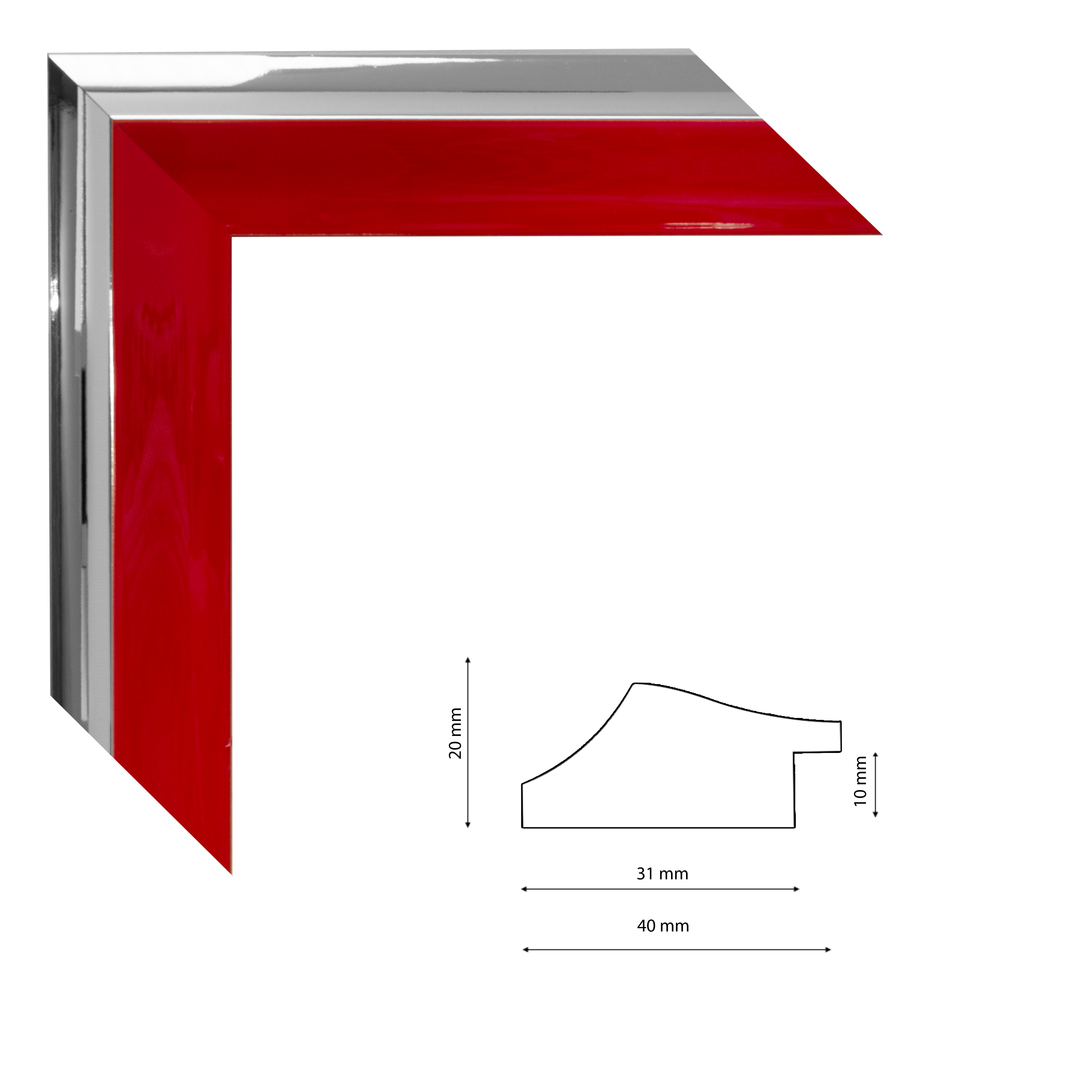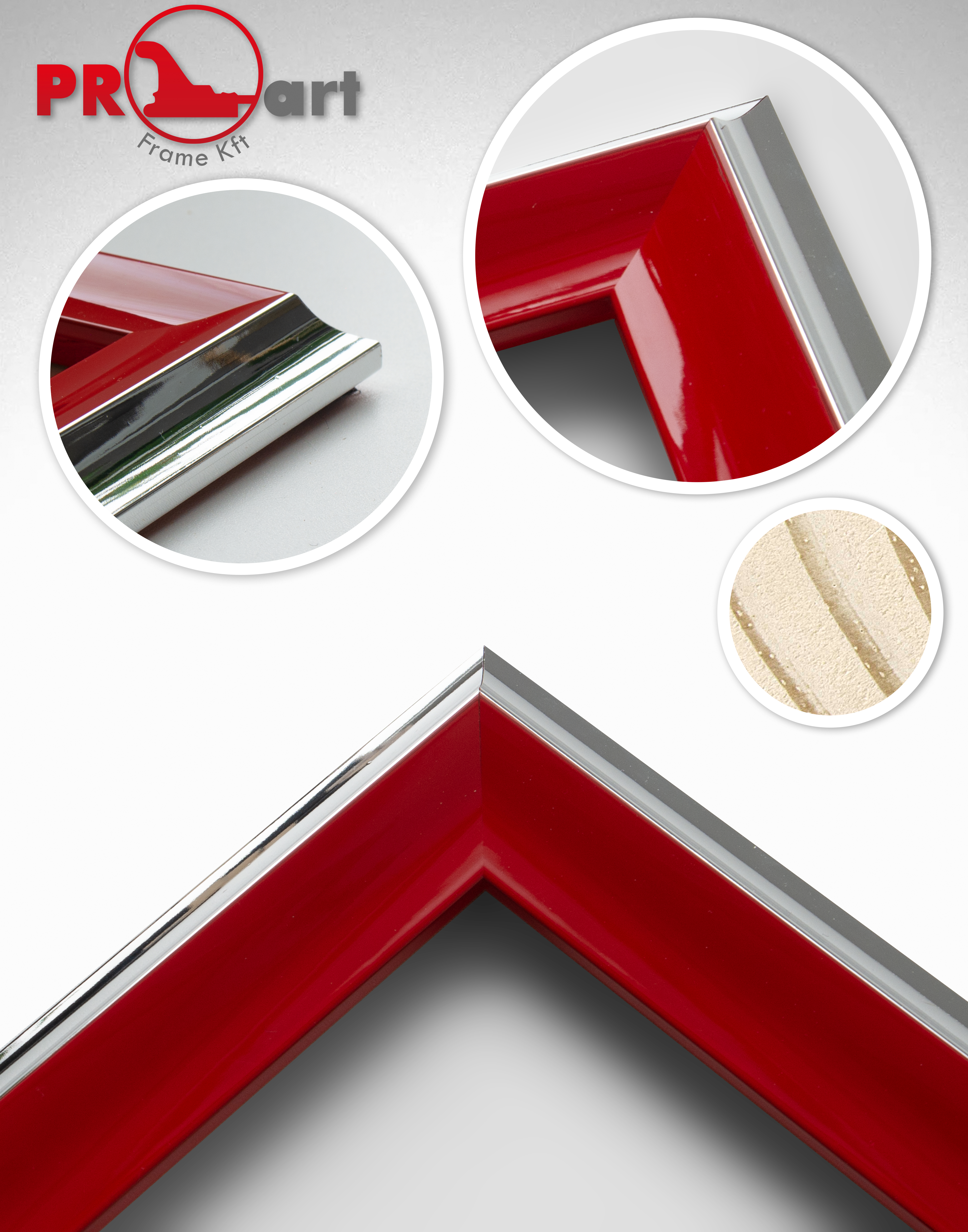 Fényes felületű, modern képkeretléc ezüst-piros színben.