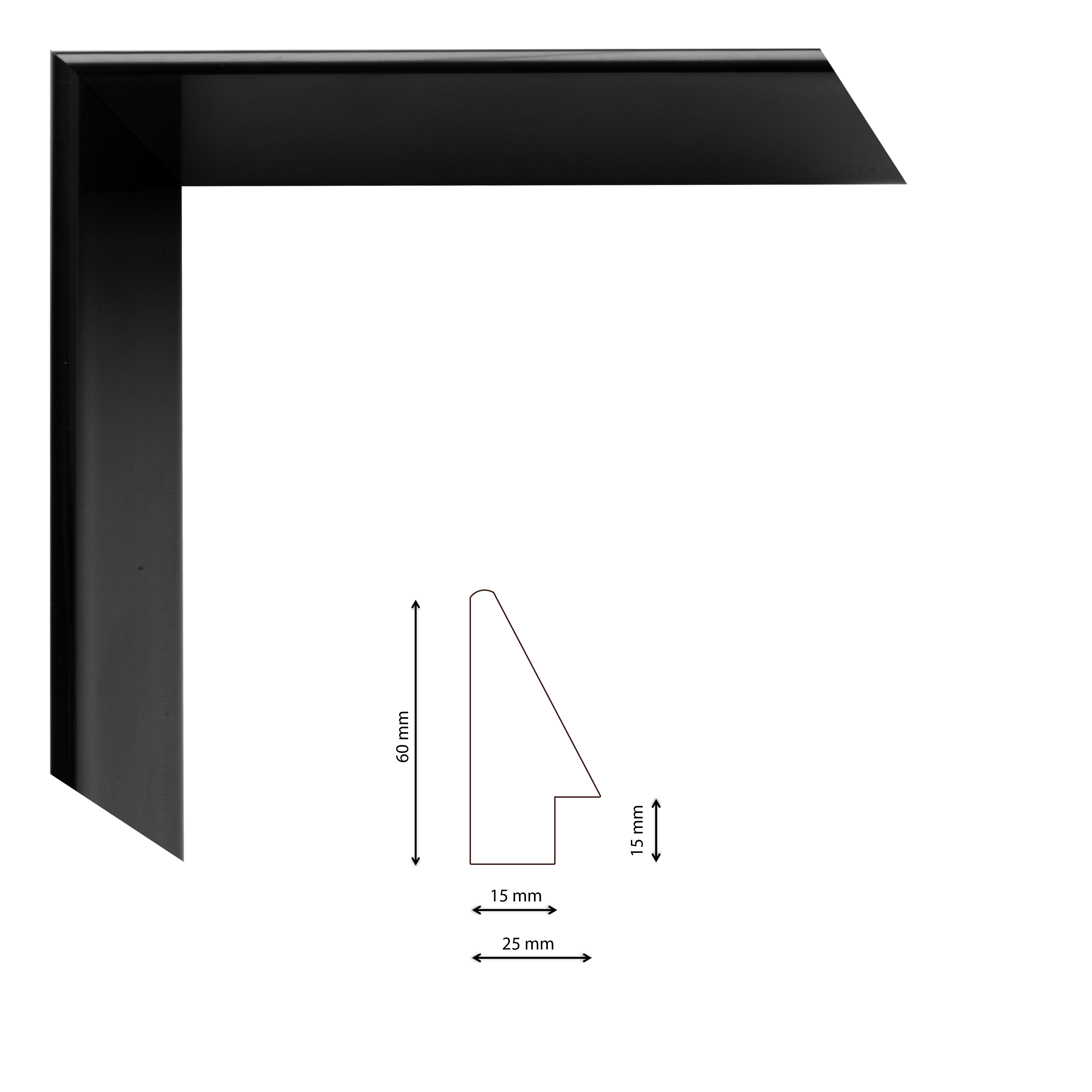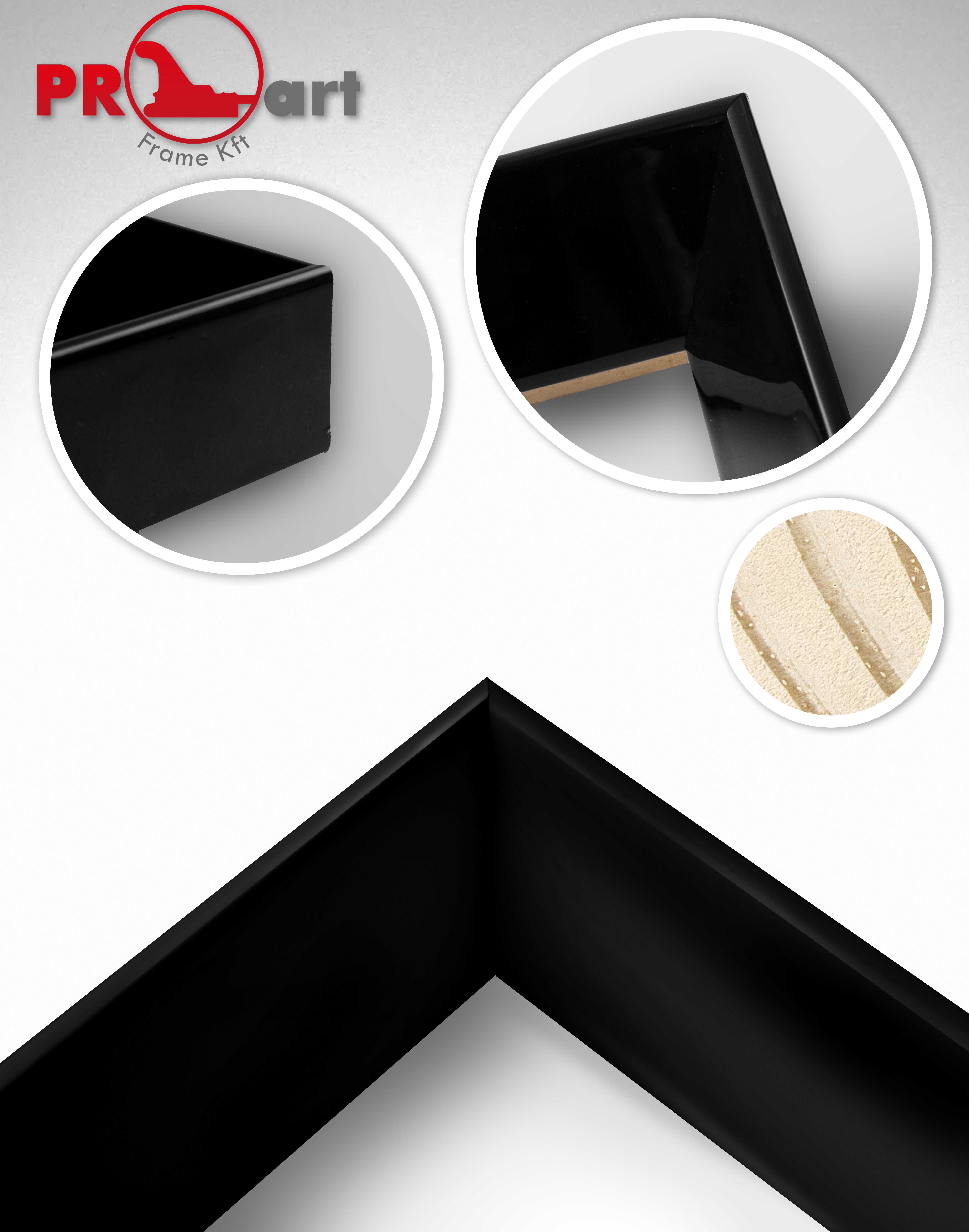 Lakk felületű, fekete színű képkeretléc fenyőből.