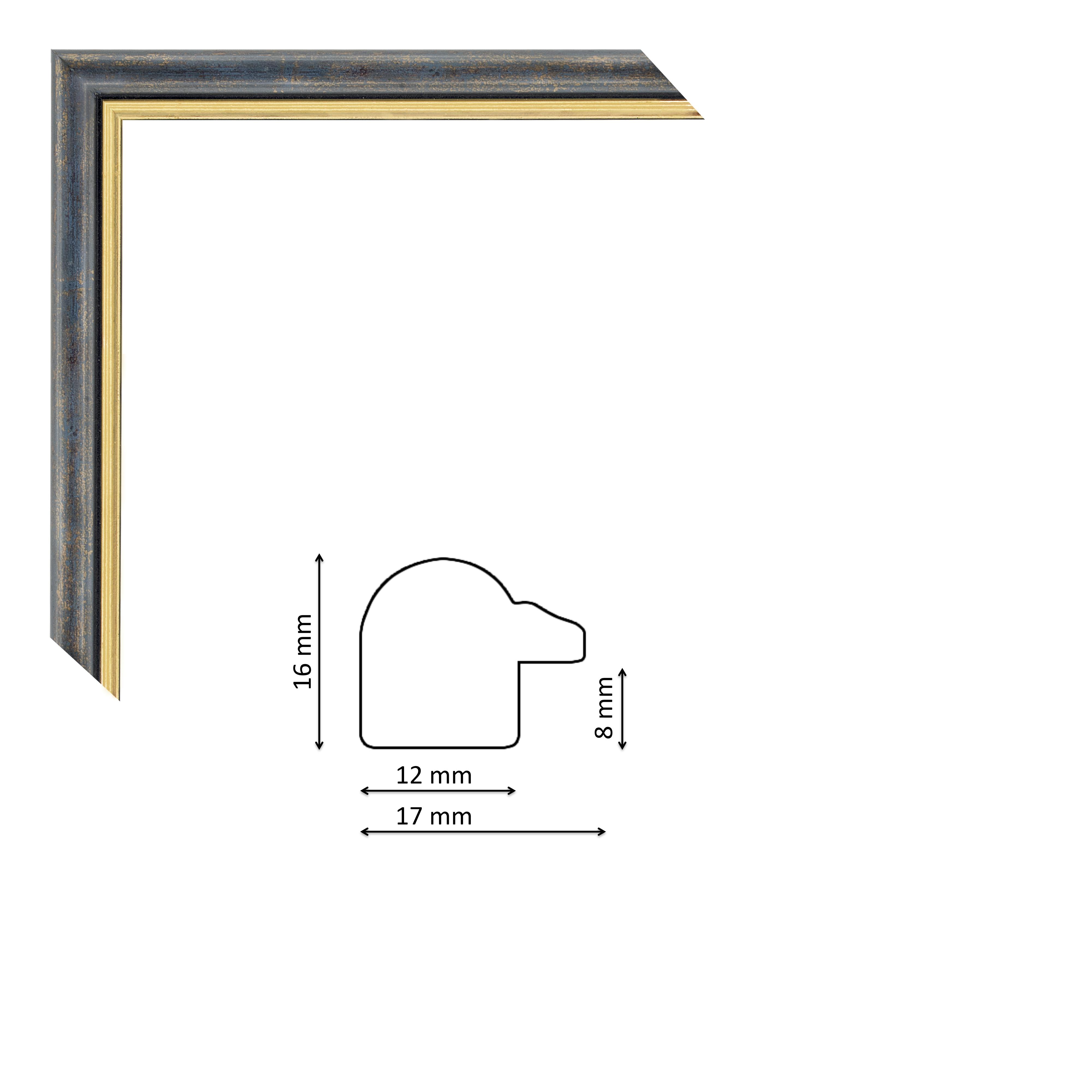 Keskeny lengyel képkeretléc kék-arany színkombinációban, vörösfenyőből.